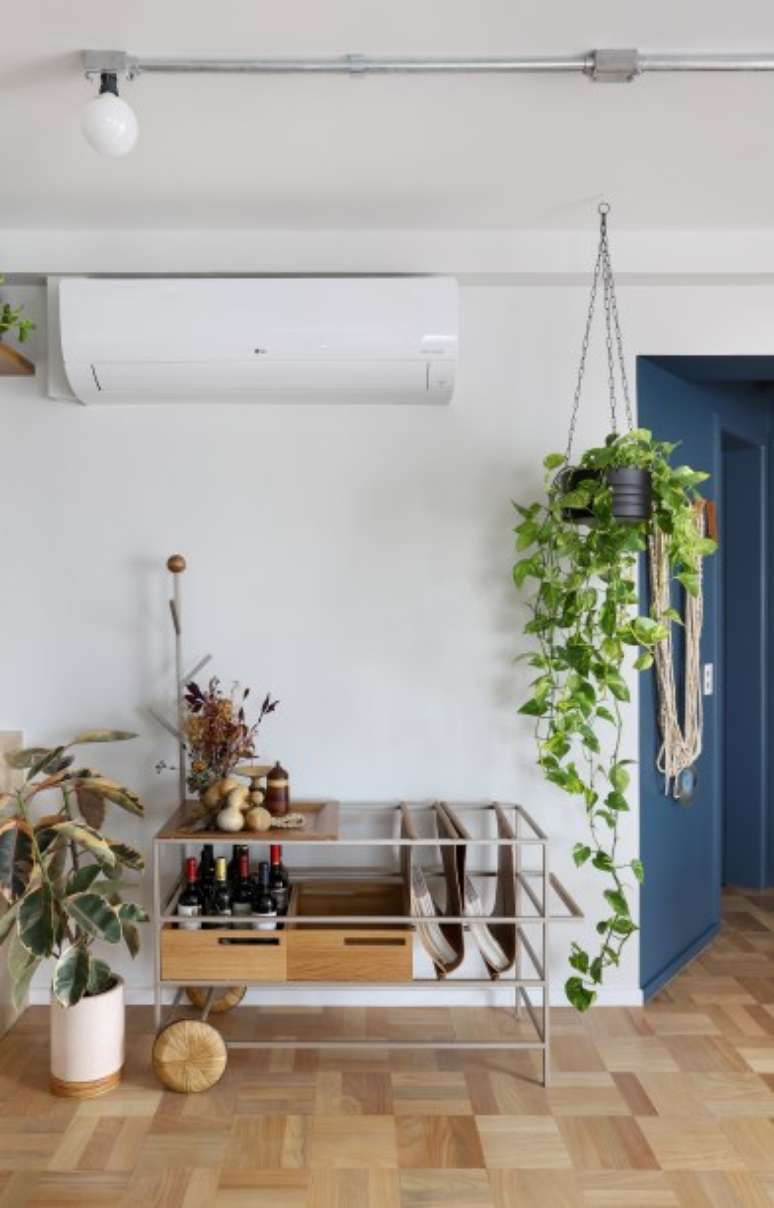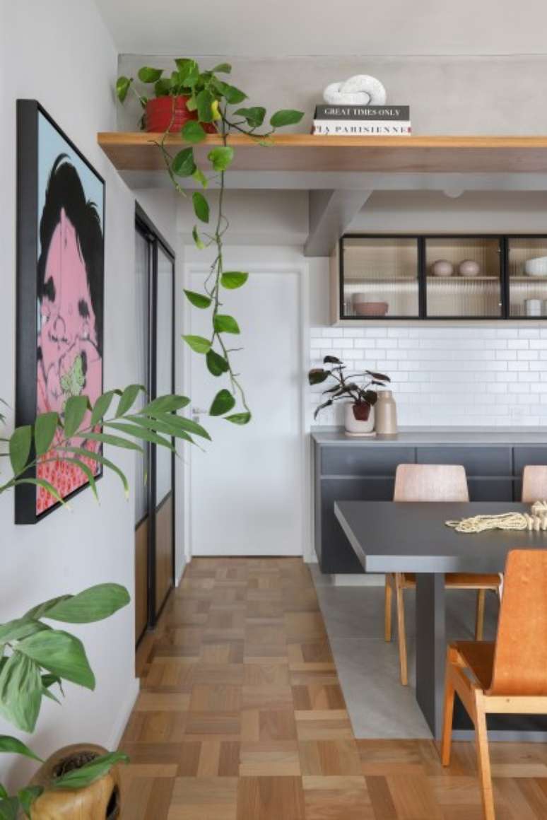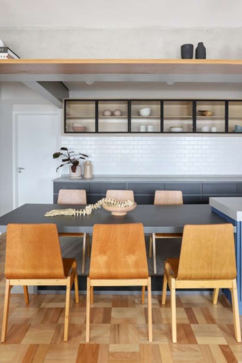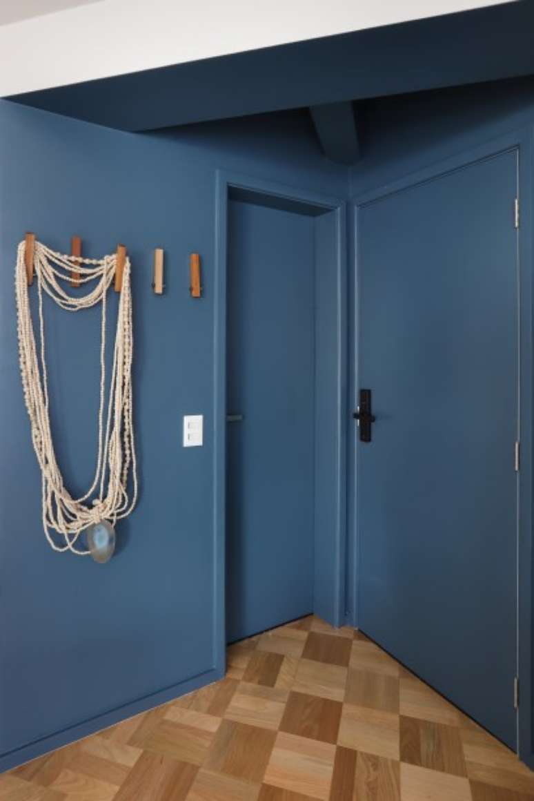 Logo na entrada, o hall ganhou um color block na cor azul escuro usado nas paredes, rodapés e portas contrastando com o taquinho de madeira clara. Neste espaço destaque para os penduradores de bolsas e casacos que abrem e fecham dando um toque de charme descontraído.