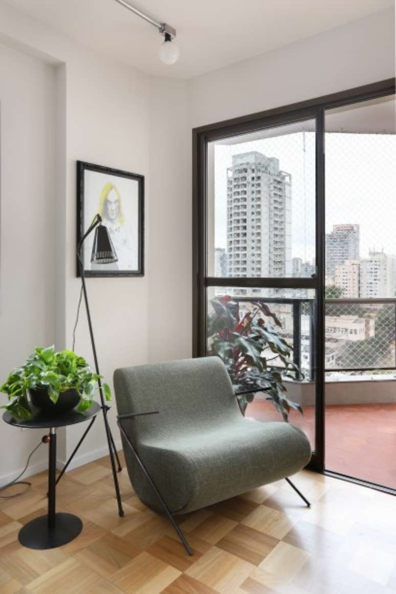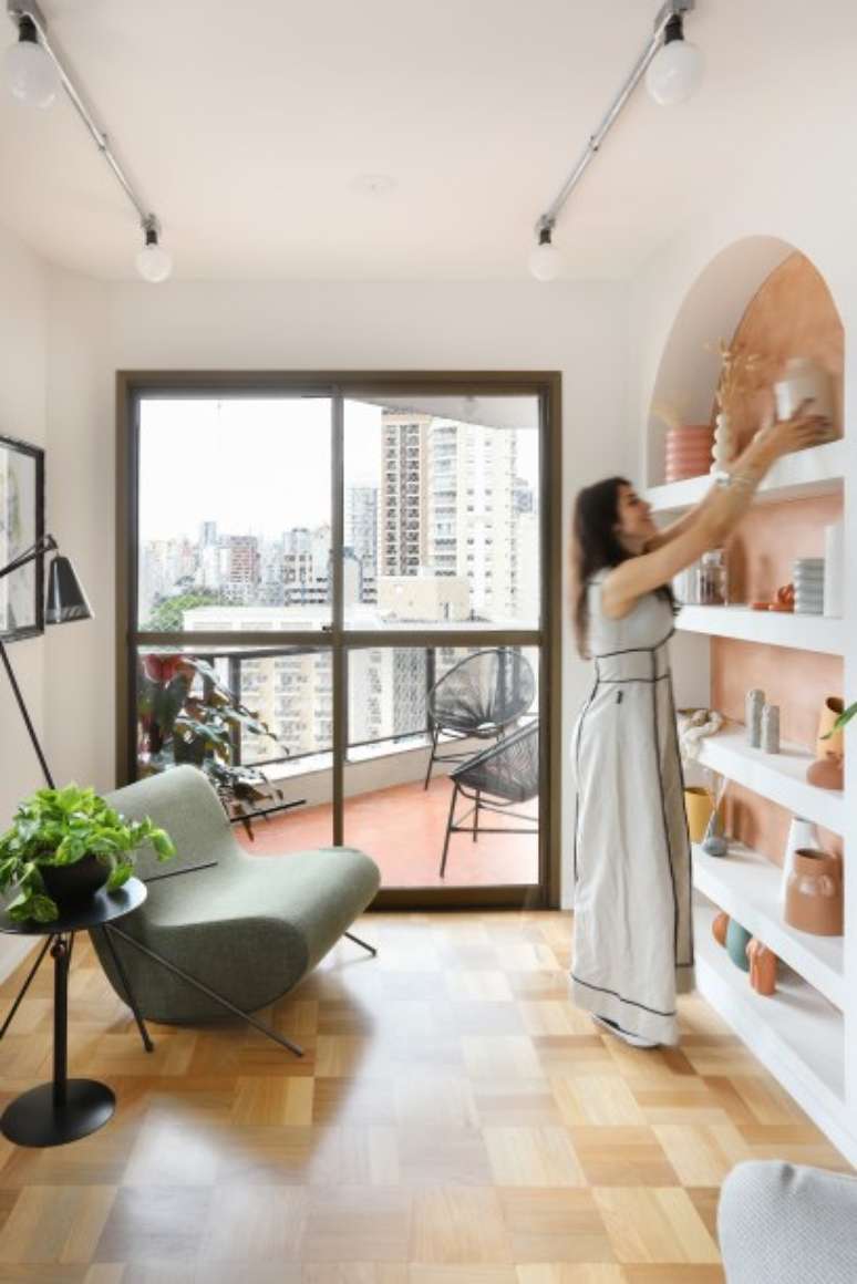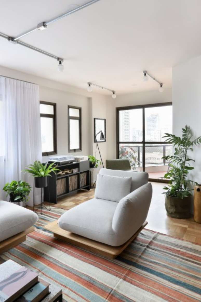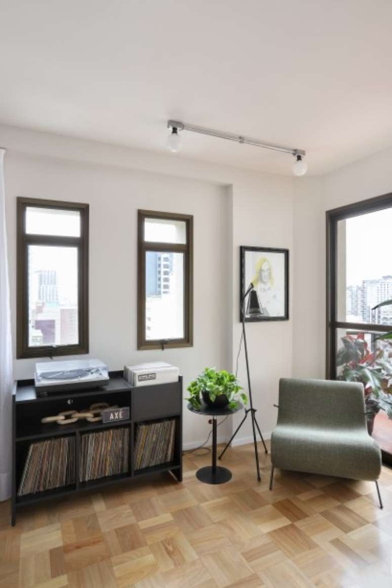 A área de descompressão, onde o casal costuma ficar para ouvir música recebeu uma confortável poltrona e rack com o acervo de LPs e até uma antiga vitrola 3 em 1. No local foi criada também uma estante com design arcado partindo da parede estrutural do prédio.