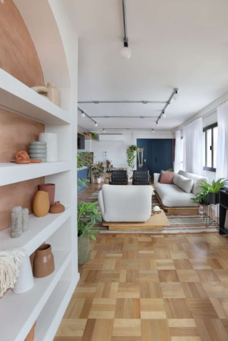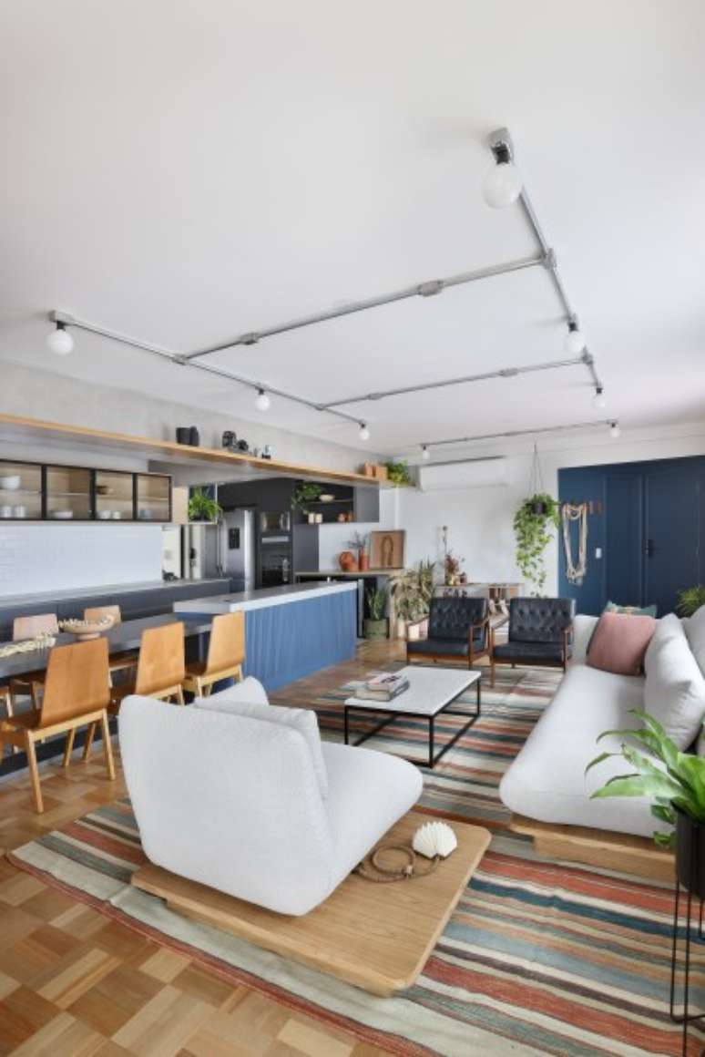 Para começar as arquitetas optaram em derrubar a enorme parede que dividia a sala da cozinha, criando assim uma enorme área de convivência integrada. A reforma permitiu também mais ventilação, luminosidade e boa circulação ao apartamento.