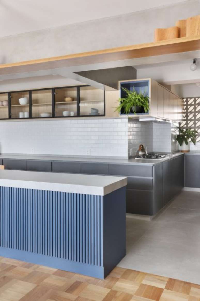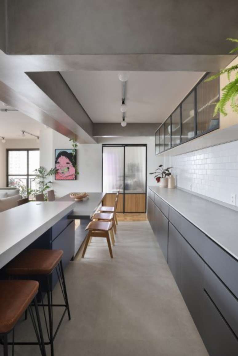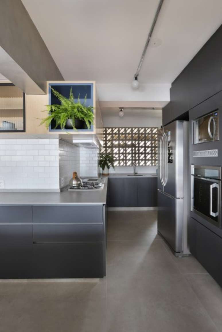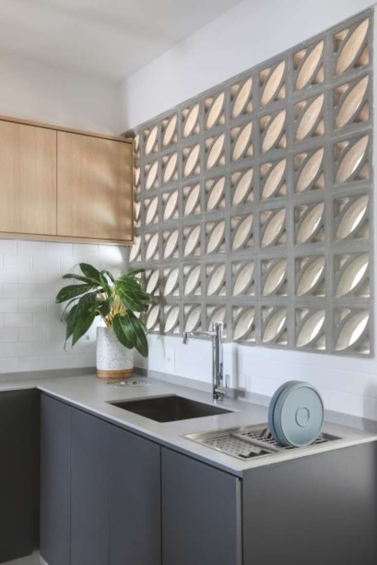 A área molhada da cozinha recebeu o mesmo acabamento da bancada e armários em fórmica cinza e para manter tudo organizado, lixeira embutida e cuba com calha embutida. Setorizando a cozinha da lavanderia, a parede da área molhada foi substituída por cobogós, estes elementos vazados permitem ventilação e iluminação natural. A porta que leva à lavanderia foi criada em serralheria, vidro canelado e detalhe em madeira na parte inferior.