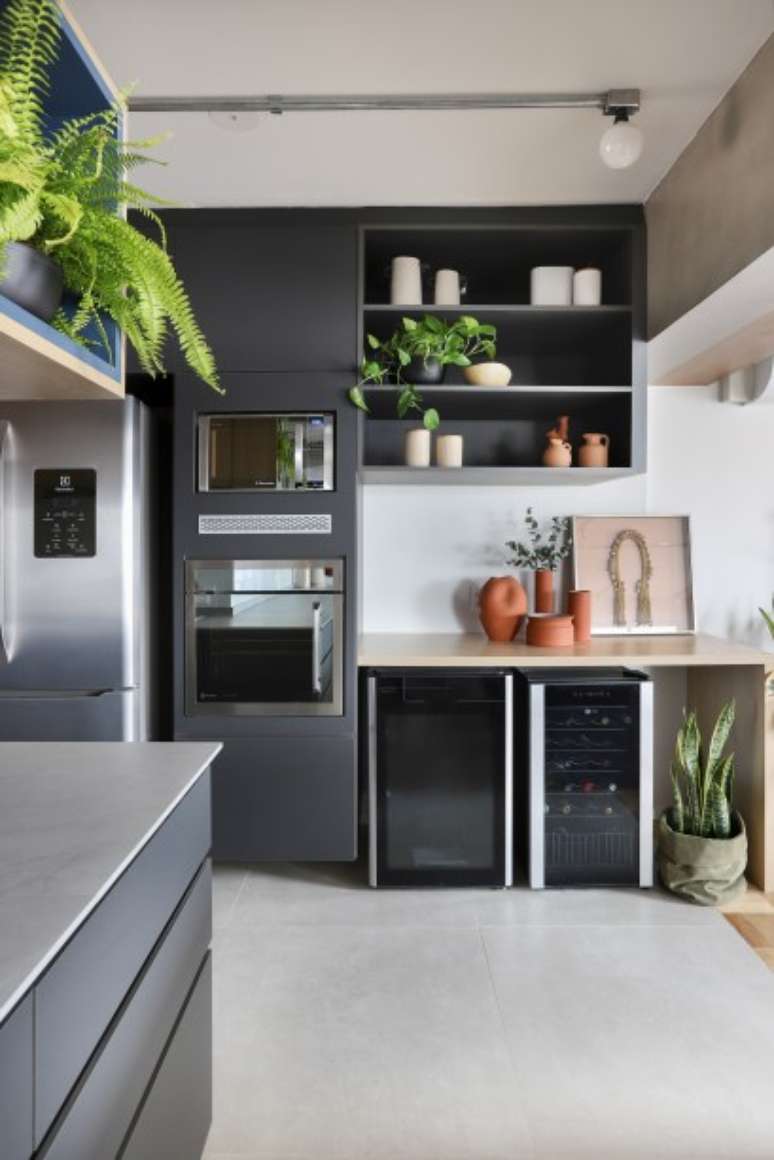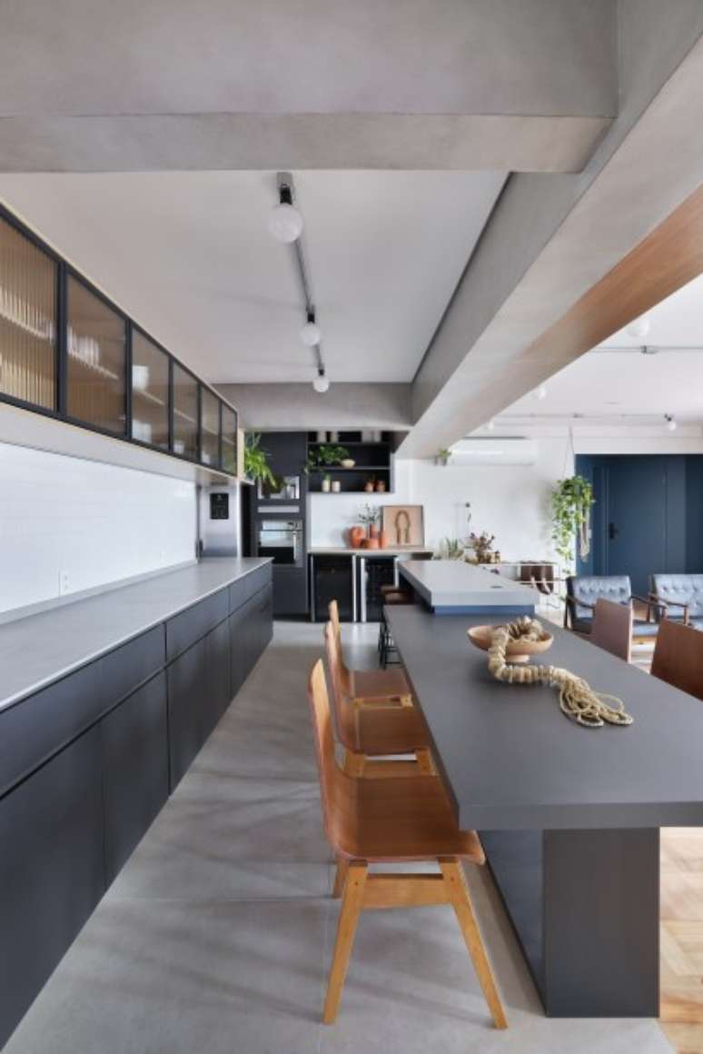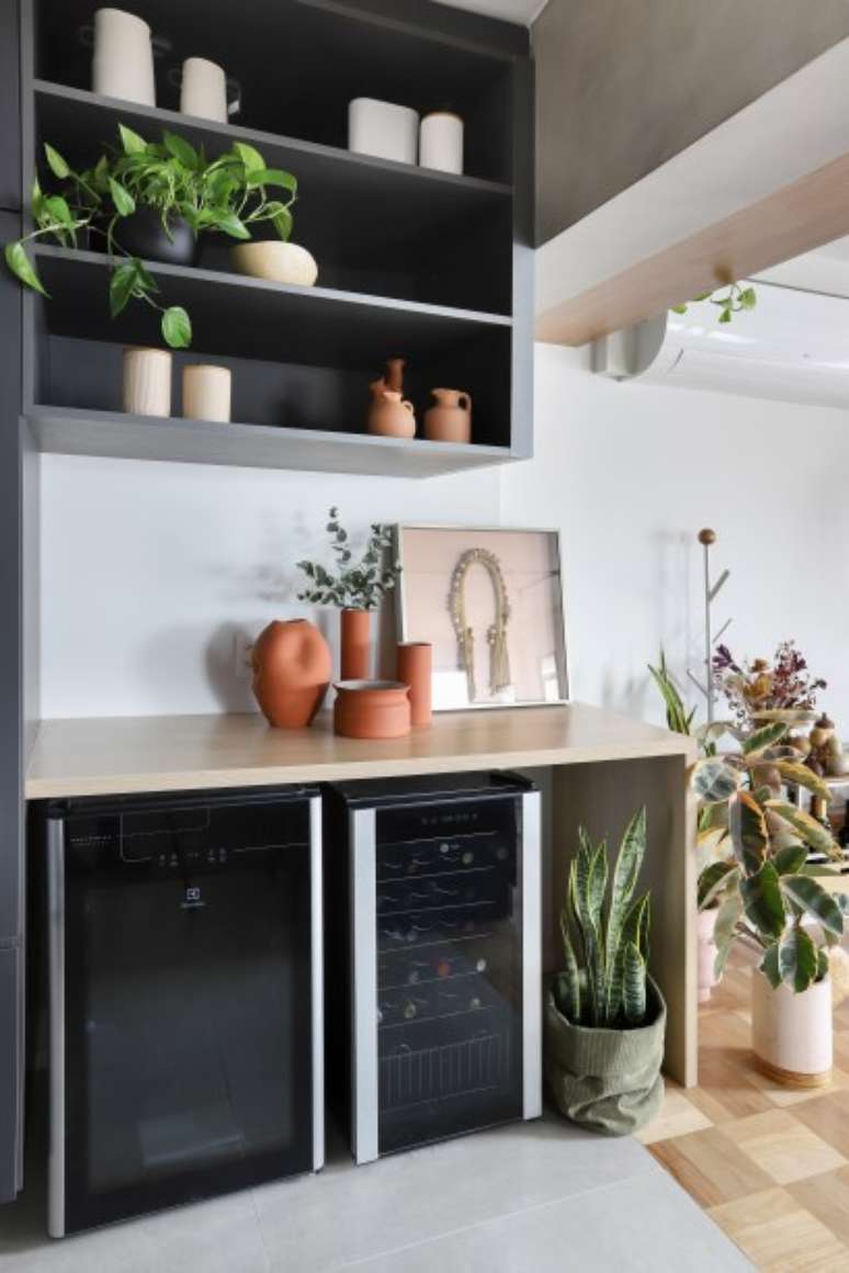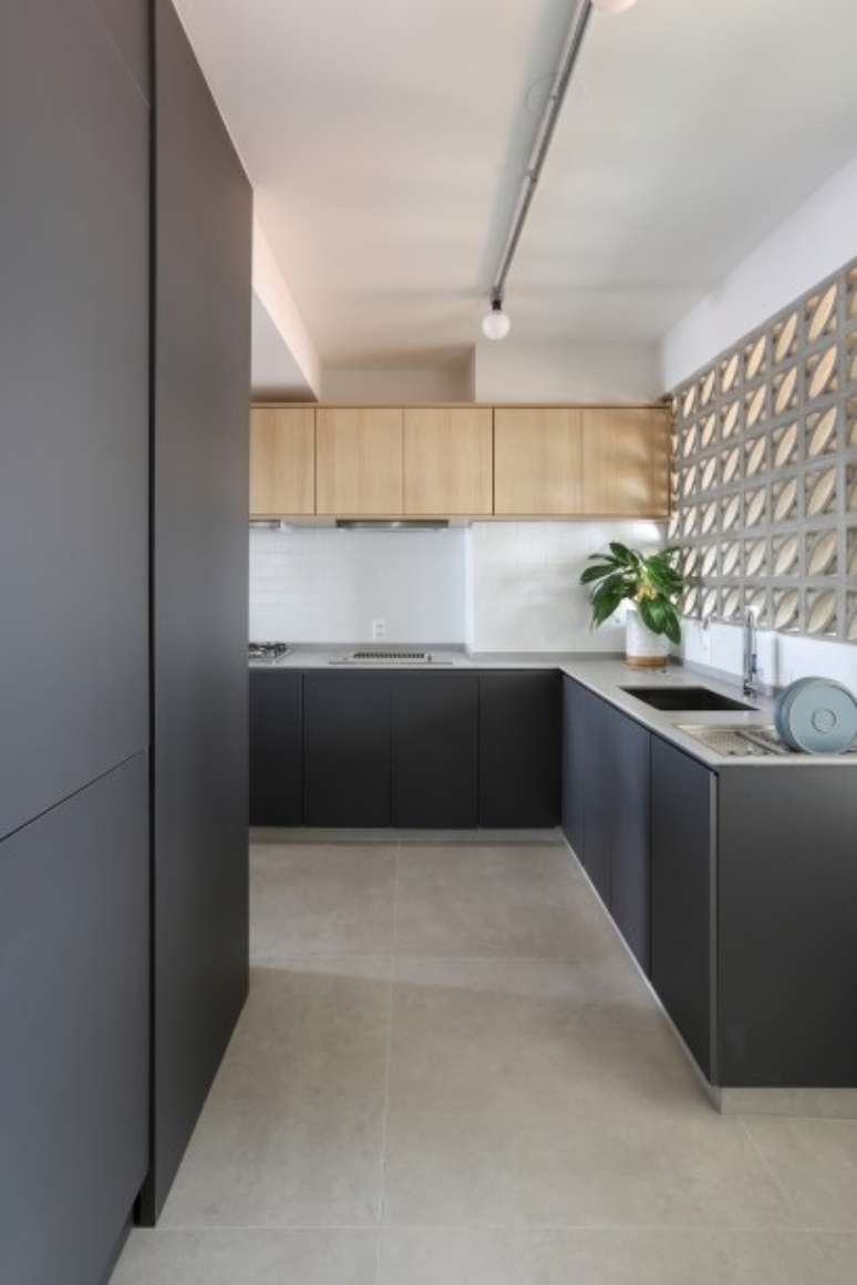 A área molhada da cozinha recebeu o mesmo acabamento da bancada e armários em fórmica cinza e para manter tudo organizado, lixeira embutida e cuba com calha embutida. Setorizando a cozinha da lavanderia, a parede da área molhada foi substituída por cobogós, estes elementos vazados permitem ventilação e iluminação natural. A porta que leva à lavanderia foi criada em serralheria, vidro canelado e detalhe em madeira na parte inferior.