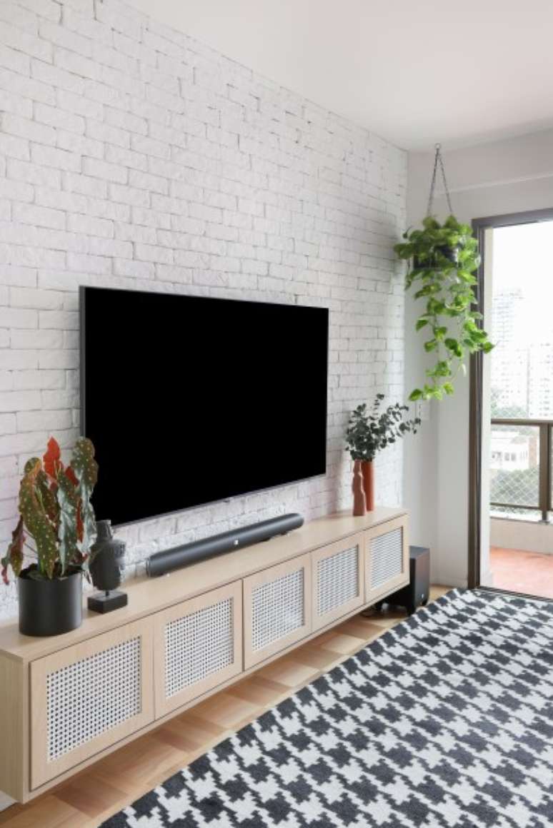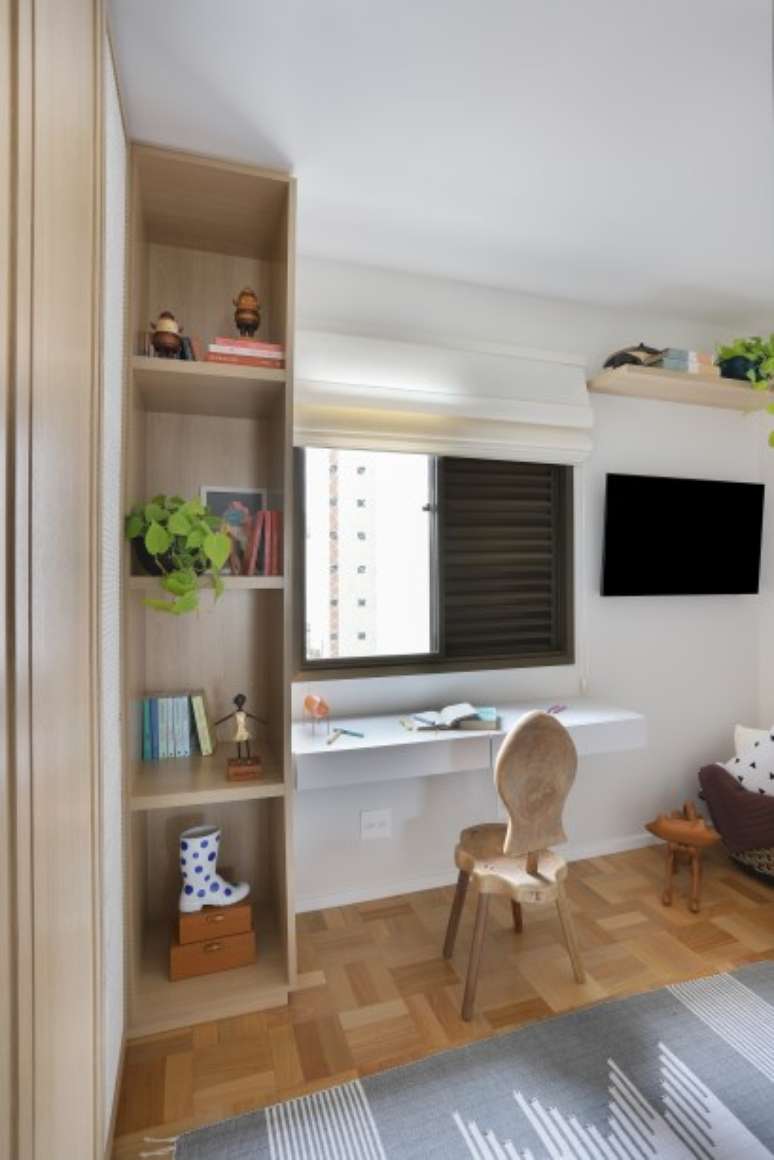 Um dos quartos foi transformado em sala de TV com sofá cama. Para manter a integração e ao mesmo tempo a privacidade, as arquitetas optaram em uma porta de correr.