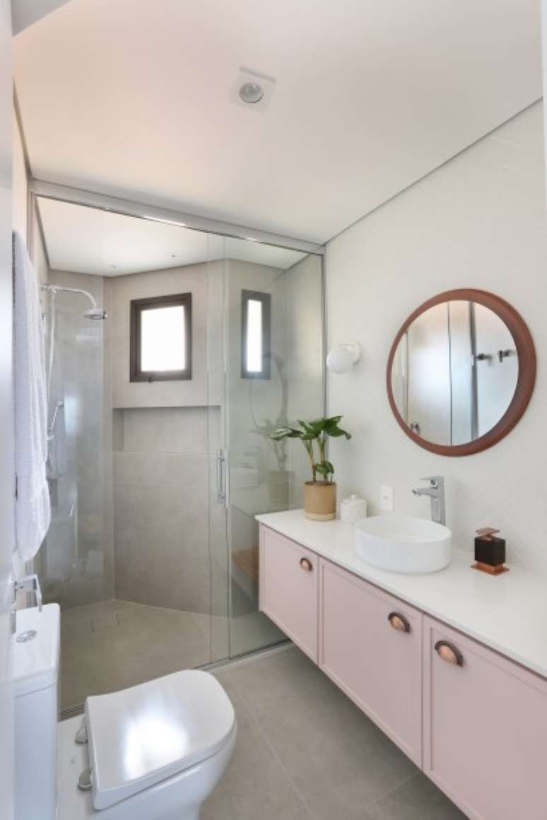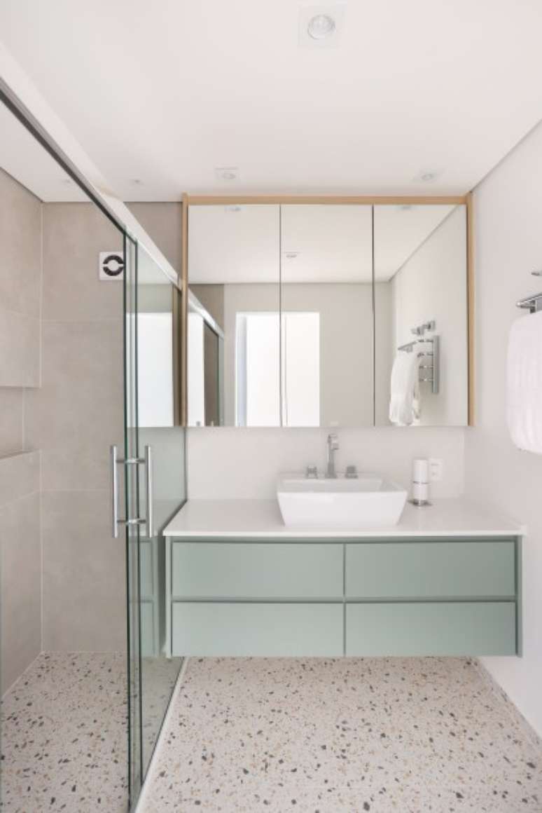 No banheiro da suíte foi usado no piso porcelanato Granilite que imprime um ar despojado e contemporâneo. A bancada em quartzo branco possui duas gavetas e duas basculantes em fórmica na cor verde pastel com cuba de sobrepor com design reto. Armário espelhado com cava escondida é amplo e um curinga para guardar produtos de higiene pessoal e cosméticos e totalmente emoldurado com iluminação led.