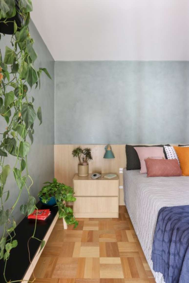 Por se tratar de uma reforma, o piso de tábuas largas foi retirado e substituído por taquinho com paginação dama em toda área social e íntima. Para delimitar os espaços entre o social e a cozinha, o escritório optou pelo porcelanato cimento queimado aplicado até a lavanderia.