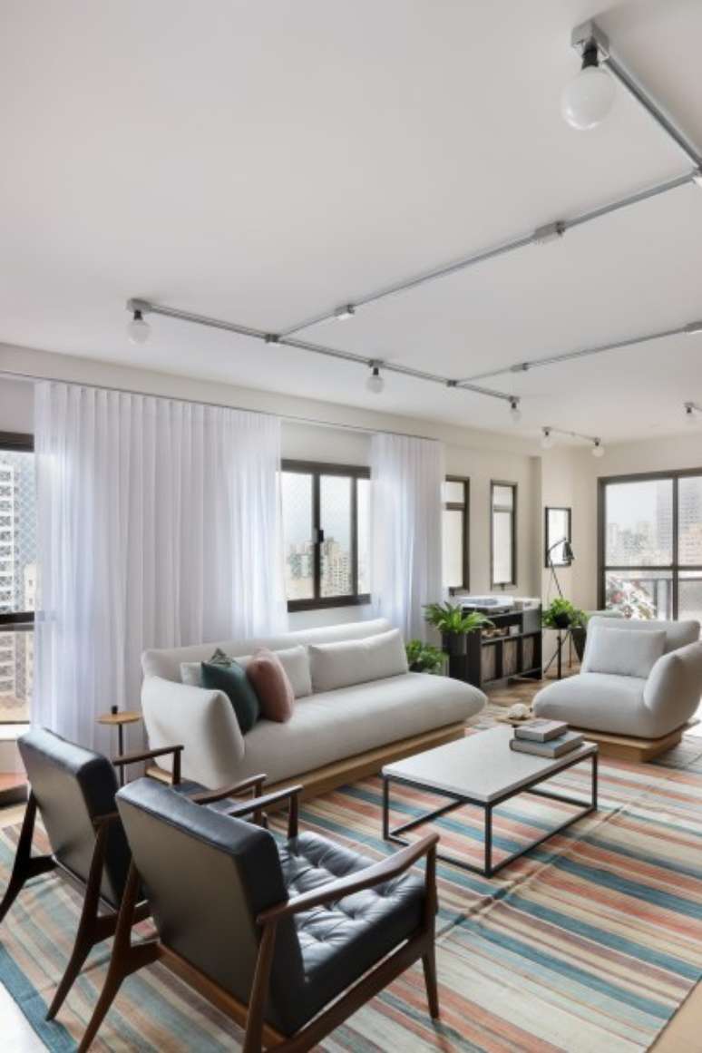 Com a unificação dos espaços, ganhou-se amplitude e pôde-se criar vários ambientes: próximo ao hall foi colocado um banco para suporte e um carrinho bar para dar as boas-vindas; no living um enorme kilim colorido emoldura as poltronas com design retilíneo (acervo dos proprietários), o conjunto do sofá e poltrona com design curvilíneo e contemporâneo com base de madeira e a mesa de centro com base em granilite.