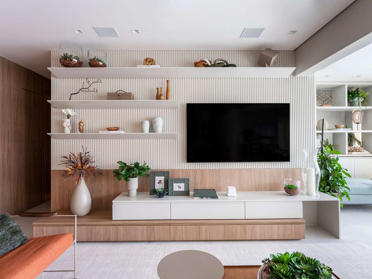Na paleta de cores do projeto, tons terrosos e de verde combinam com o branco e a madeira. Além da grande iluminação natural, pontos indiretos e fitas de leds em móveis e nichos criam cenários cênicos.