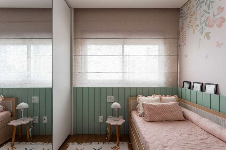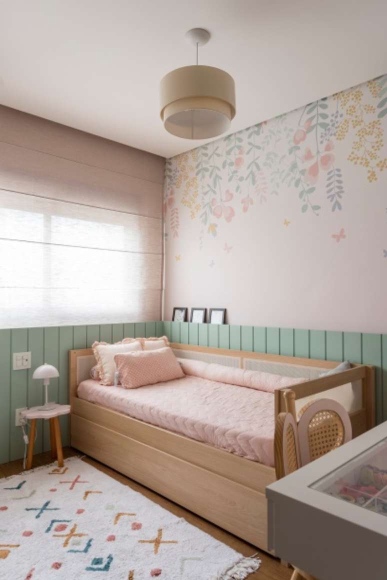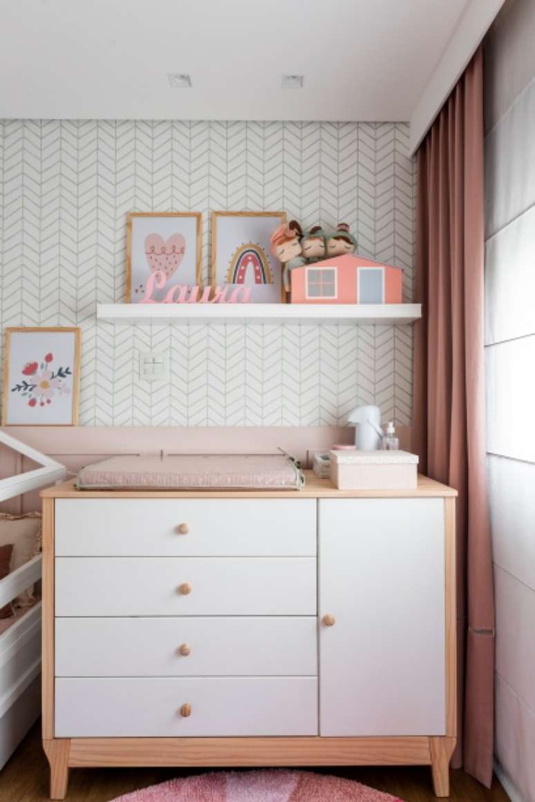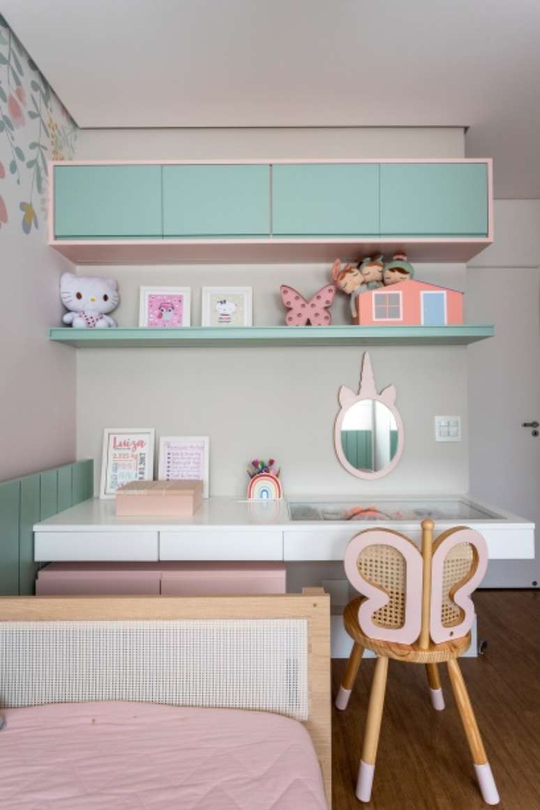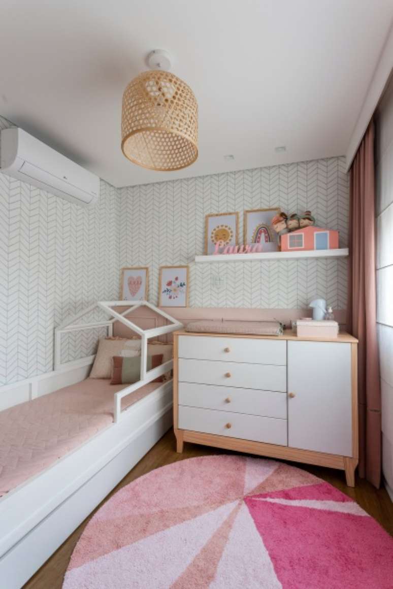 No quarto da filha de 5 anos que ama rosa, as candy colors compõem com a palha e os tecidos. O papel de parede florido cria um clima lúdico, assim como a mesa de vidro que expõe lacinhos.