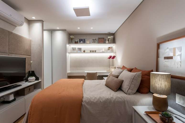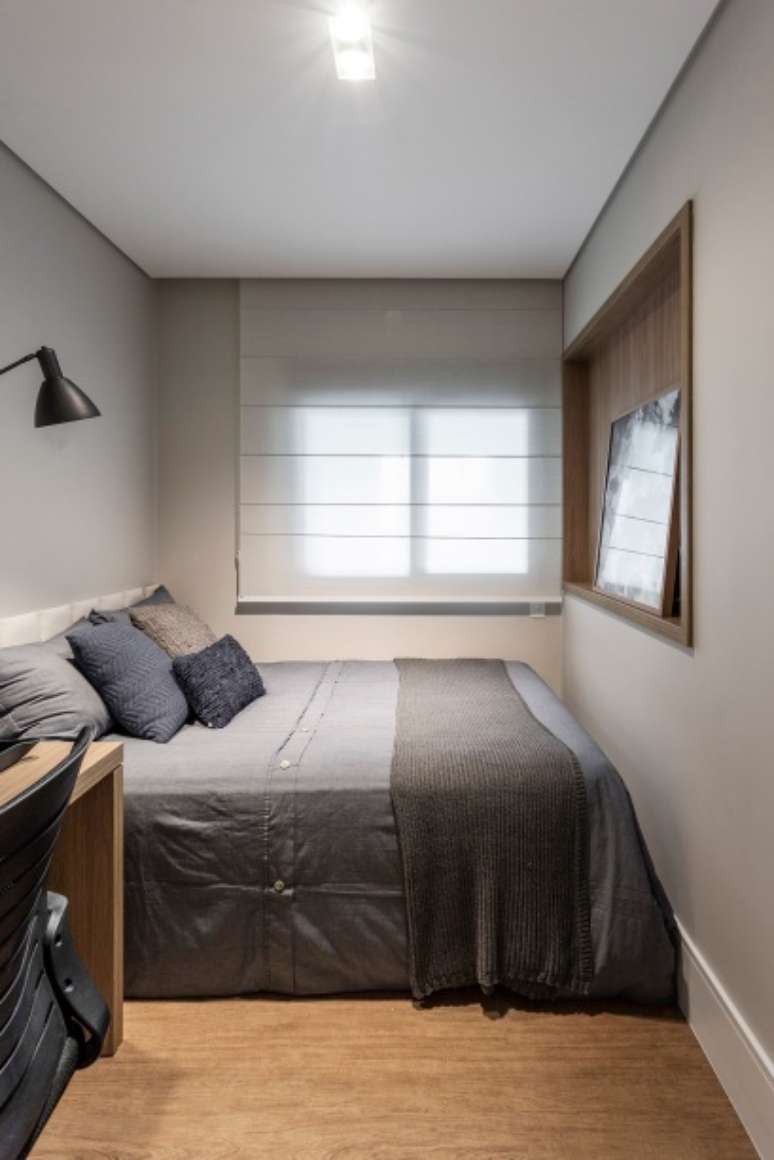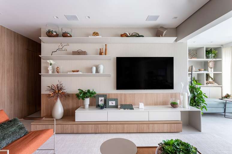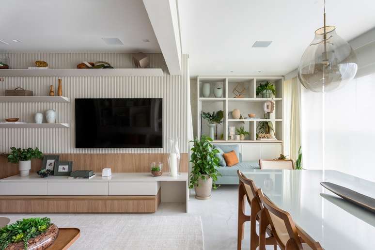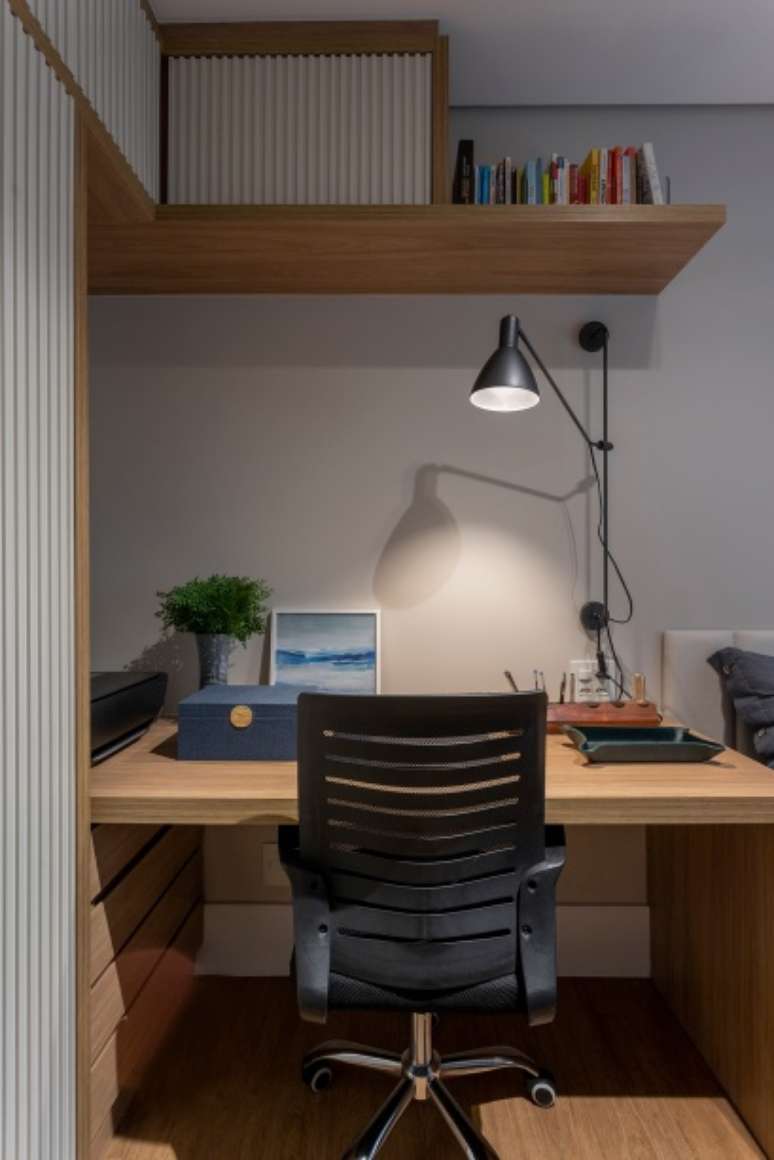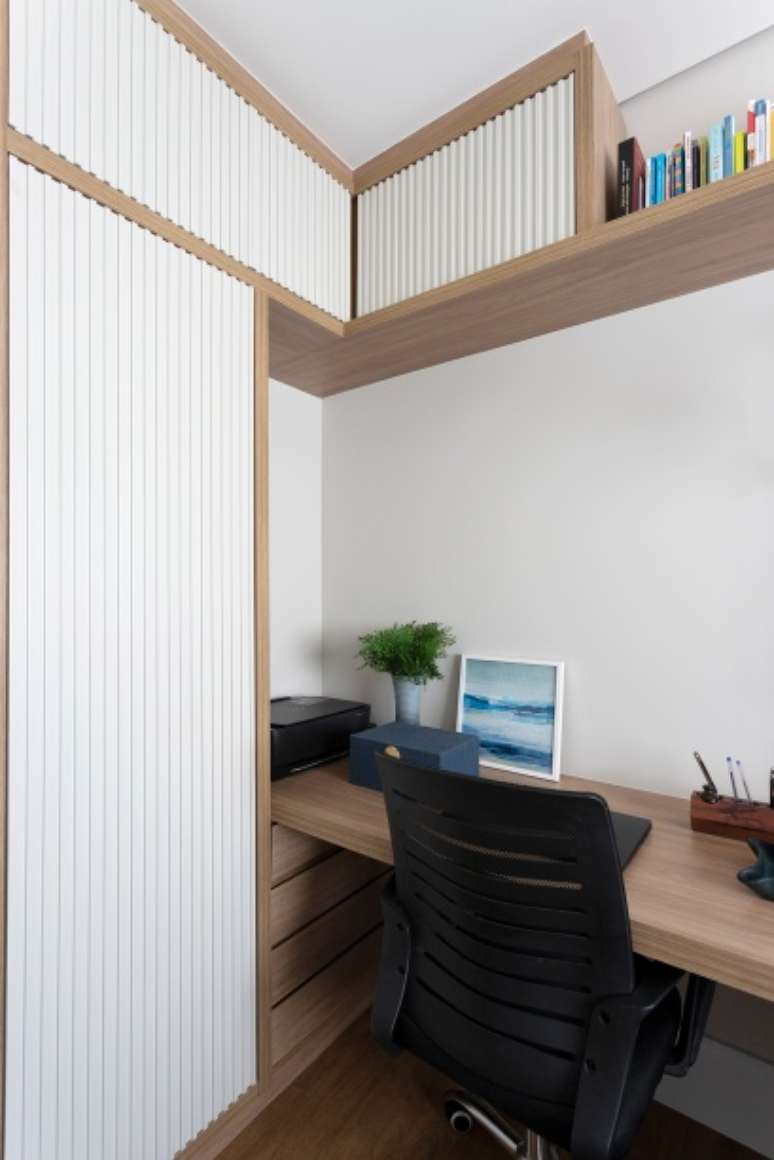 O painel atrás da TV esconde um segredo: um pedaço do living virou o quarto de hóspedes que também funciona como home office. "Nessa solução, diminuímos o tamanho da sala, sem comprometer sua funcionalidade aceitável. A janela desse novo quarto é virada para a varanda onde tem uma cortina", explica o escritório.