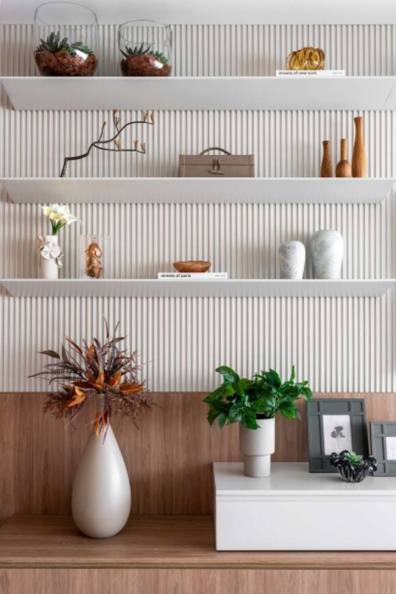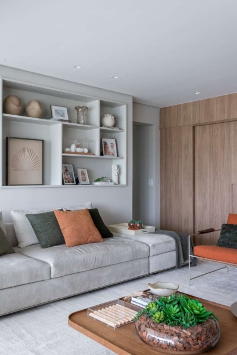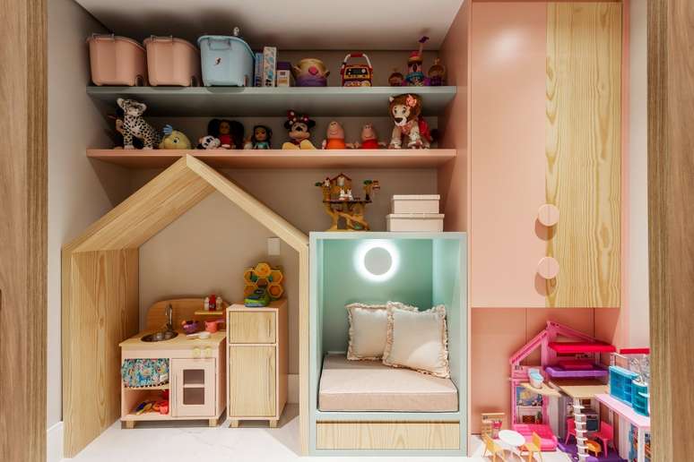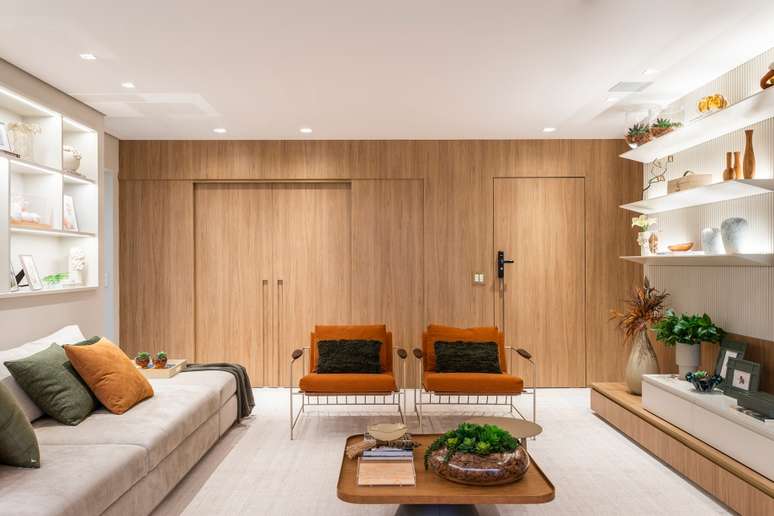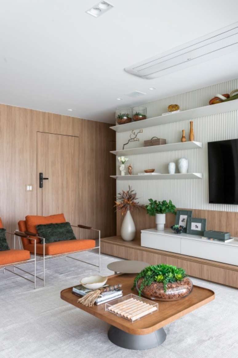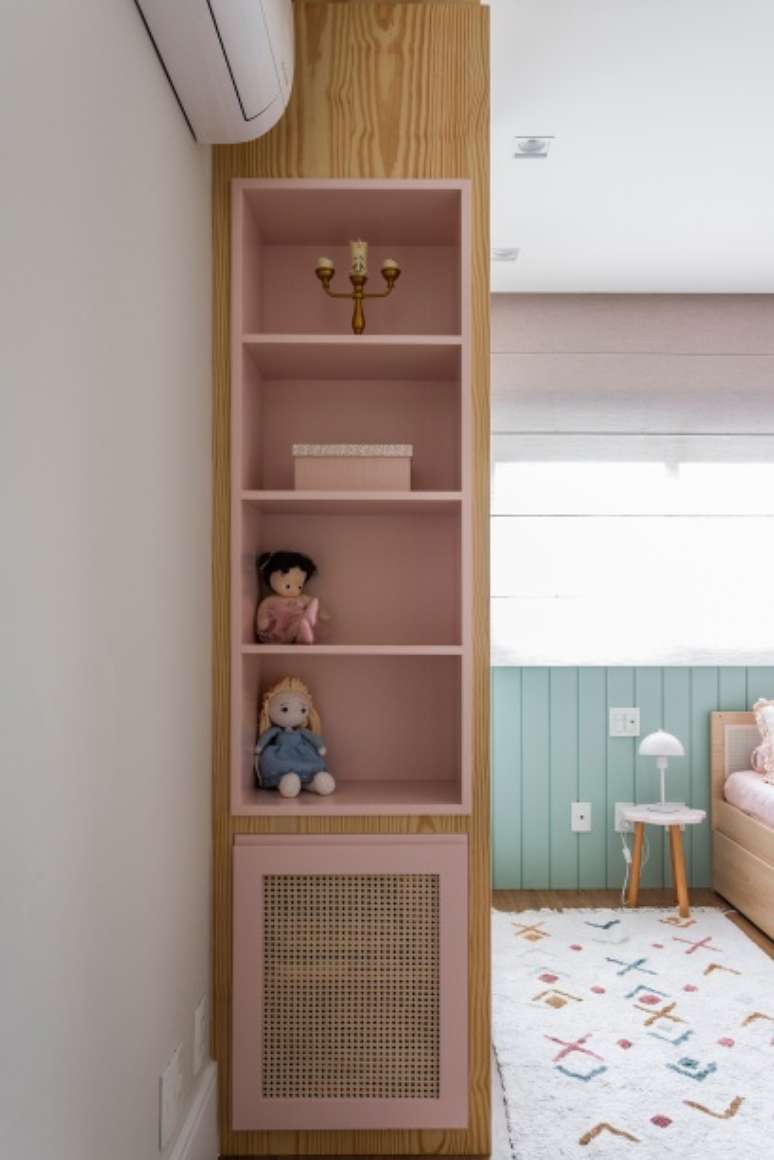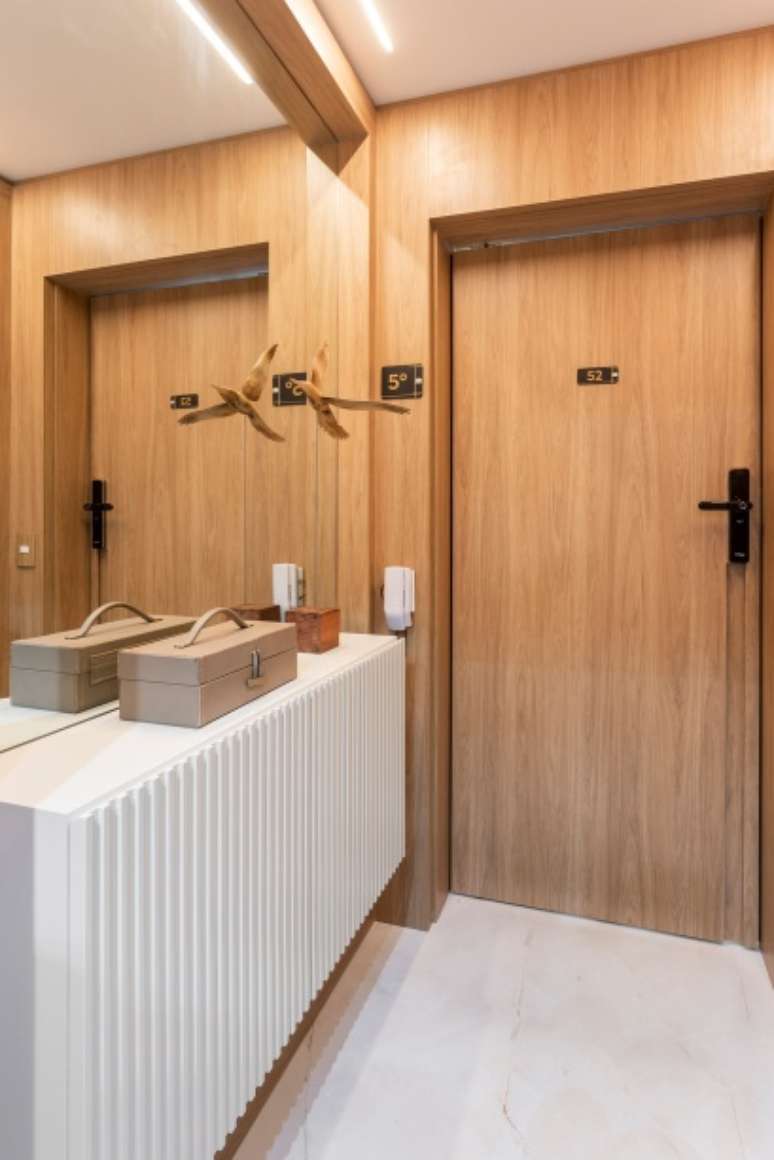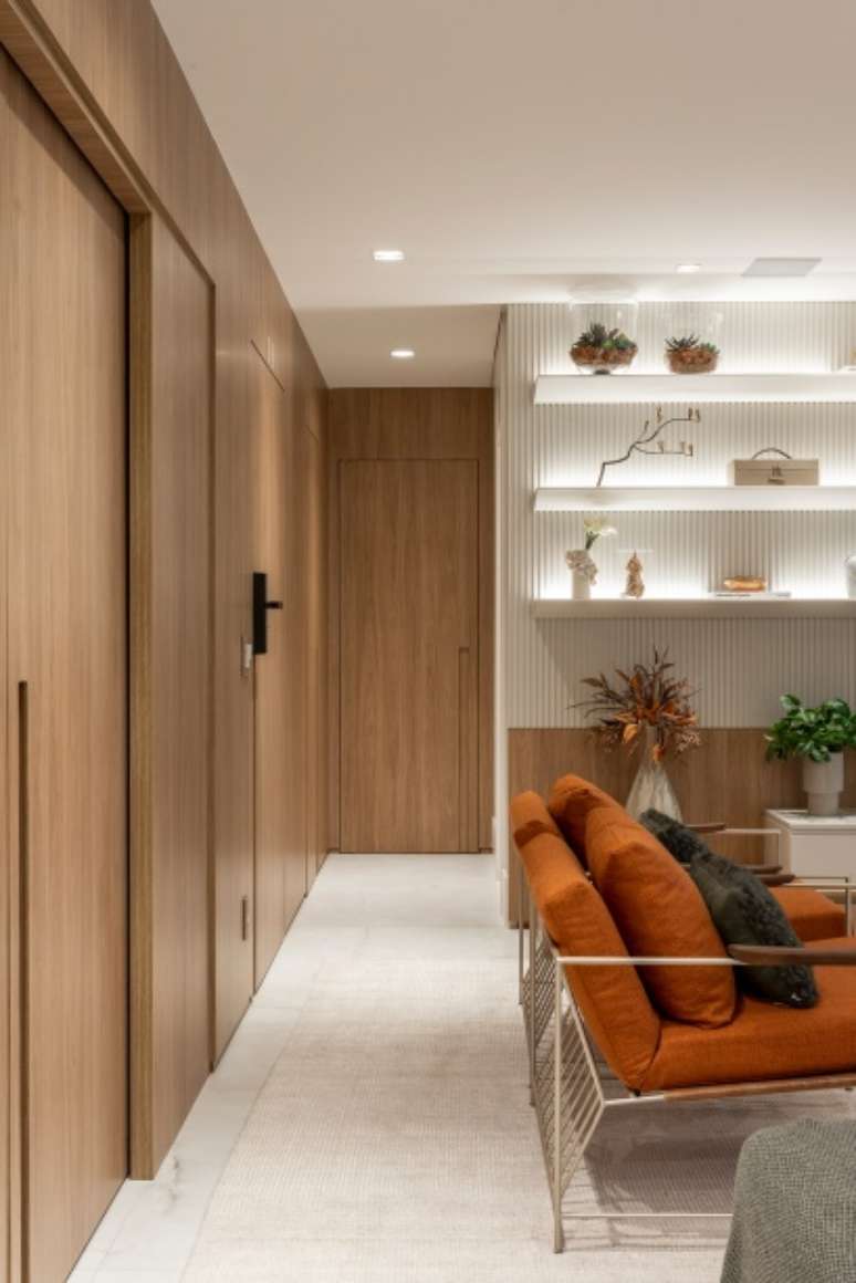 O painel de madeira lateral também camufla duas portas: a de entrada do apartamento e a da brinquedoteca - nessa última, o modelo de correr permite esconder a bagunça dos brinquedos rapidamente caso seja necessário. O espaço antes era um quarto de serviço e teve sua entrada alterada para a área social.