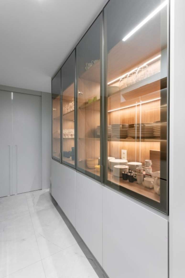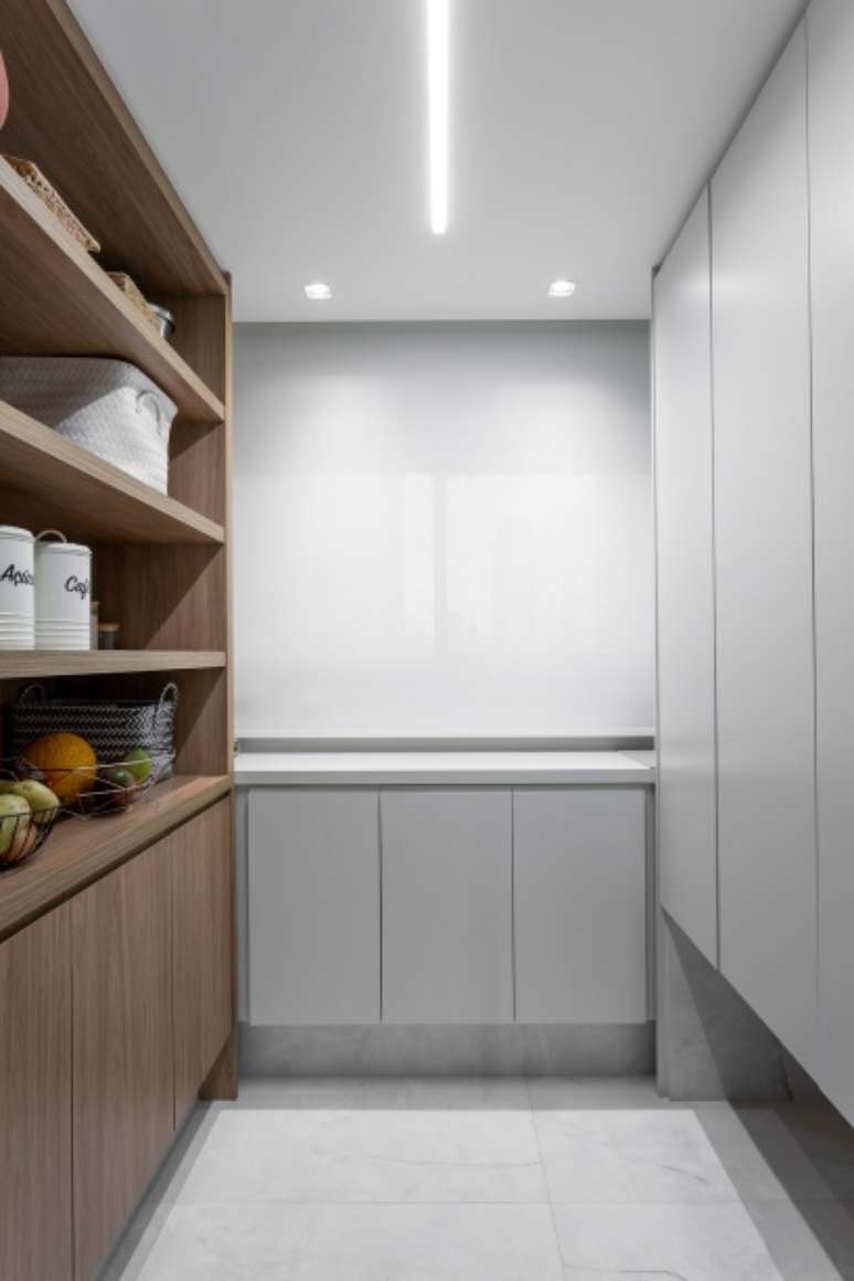Ainda pensando nos bichinhos, há um espaço na despensa integrada com a cozinha todo revestido com porcelanato embaixo do armário: é onde ficam os tapetinhos de xixi dos pets, quase como um banheiro privativo.