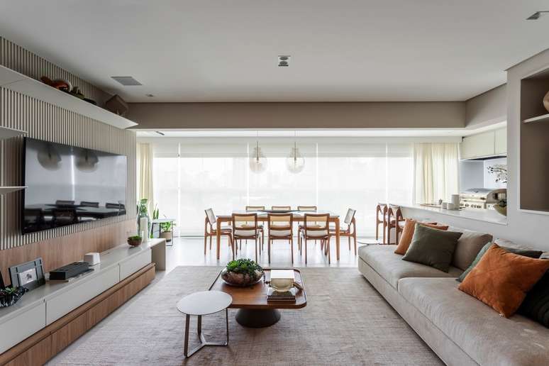 O ponto de partida do projeto deste apartamento de 230 m² em São Paulo foi usar a grande varanda com uma abudante iluminação natural como parte do living. Para isso, o escritório MRC arq.design integrou o jantar, o gourmet e a cozinha - e todos os cômodos tiveram acesso à vista para a cidade.