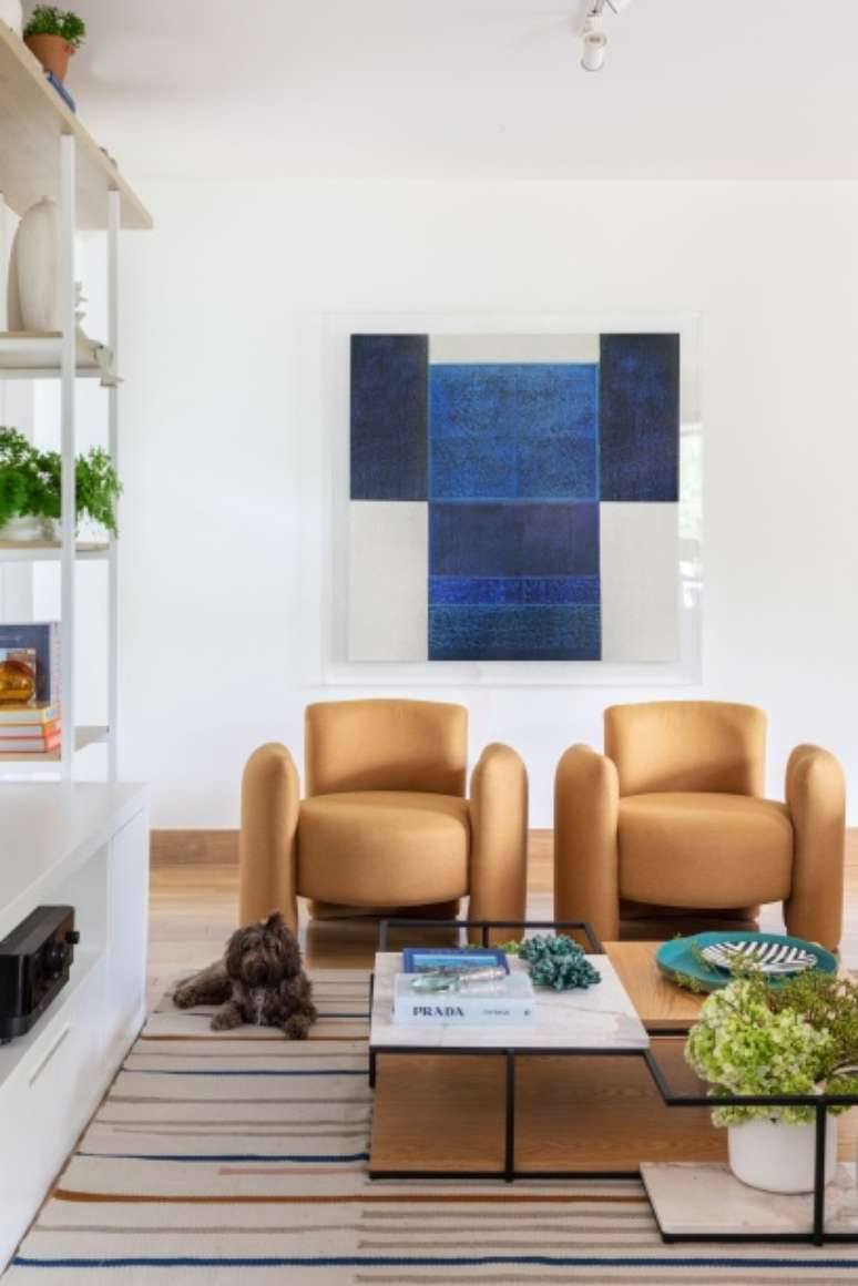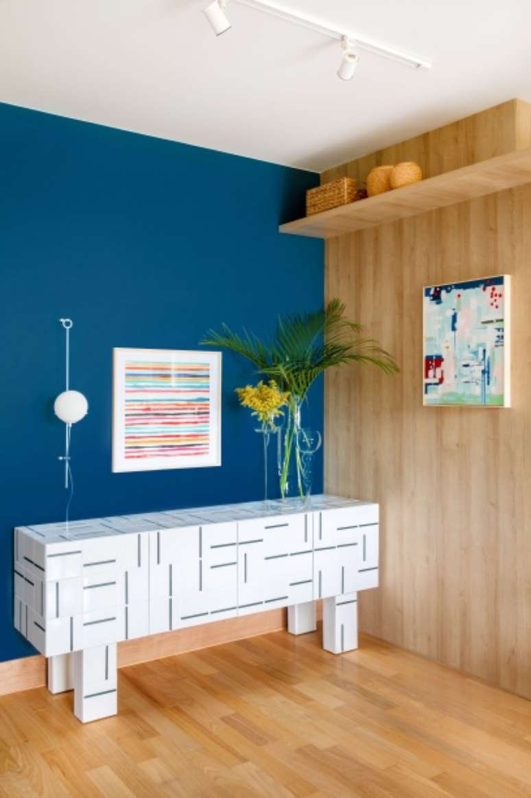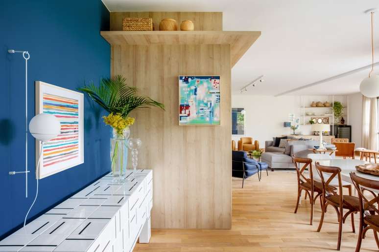 Já entre as obras de arte, vale destacar o quadro colorido sobre o buffet do artista Marcelo Catalano, as aquarelas da artista Andréa Menezes e a tela grande em tons de azul do artista Herton Roitman.