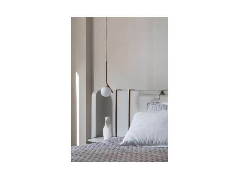 No corredor que dá acesso aos quartos, detalhes metálicos iluminados trazem uma atmosfera contemporânea e refinada.