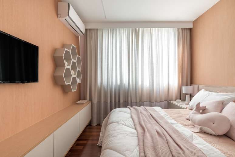 Tons claros, que favorecem a sensação de descanso, também foram aplicados nos dormitórios. Na suíte da filha do casal, o layout e os acabamentos foram pensados para acompanhar as necessidades da criança ao longo do seu crescimento, sendo um cômodo flexível e atemporal.