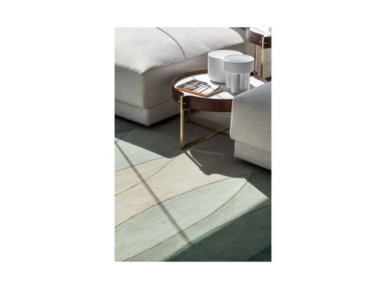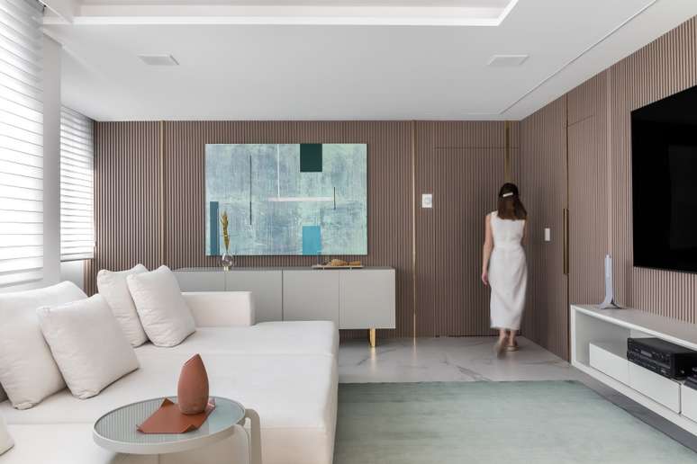 Os painéis ripados na área de estar trazem unidade ao grande ambiente integrado. Os tapetes se destacam como focos de cor, juntamente com obras de arte criteriosamente selecionadas.