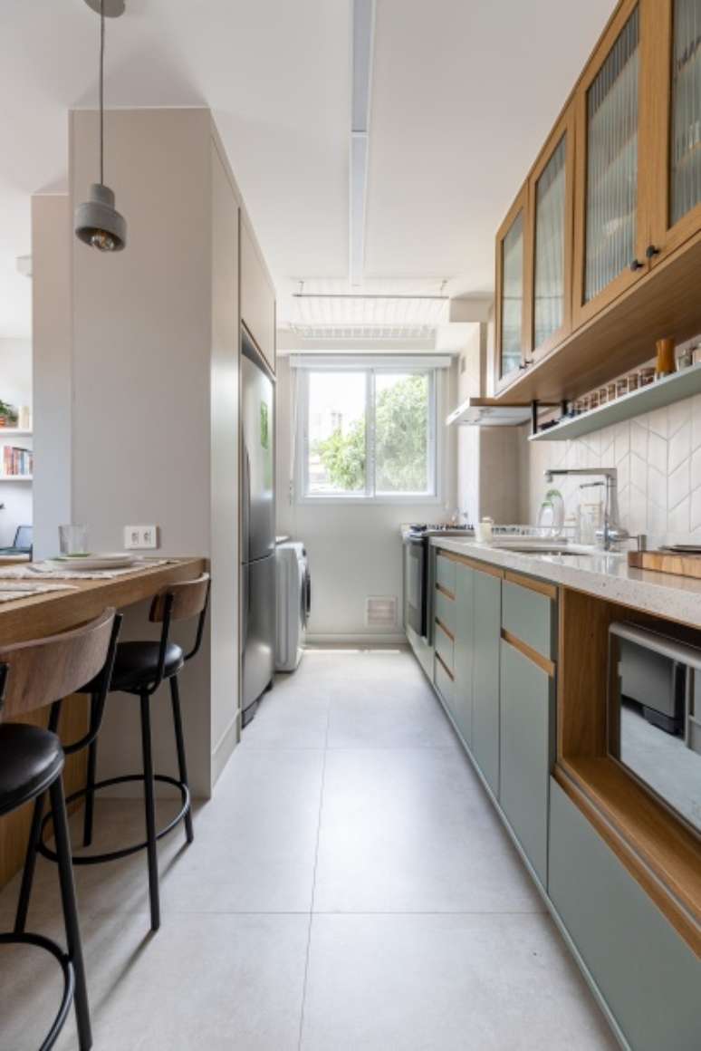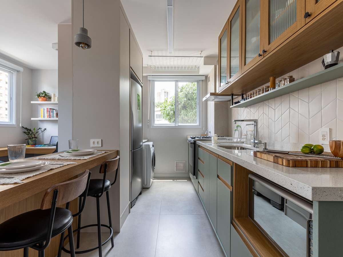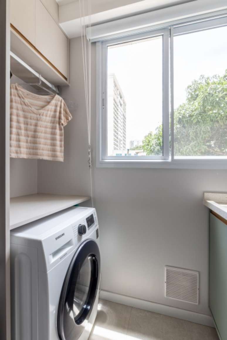 Outro pedido foi por eletrodomésticos e itens que tivessem uma dimensão bacana e não modelos mini, soluções comuns em apartamentos pequenos. A marcenaria planejada otimizou os espaços e permitiu até a instalação de uma máquina de lavar e secar roupa de um tamanho bom na lavanderia e a criação de um nicho para a geladeira.
