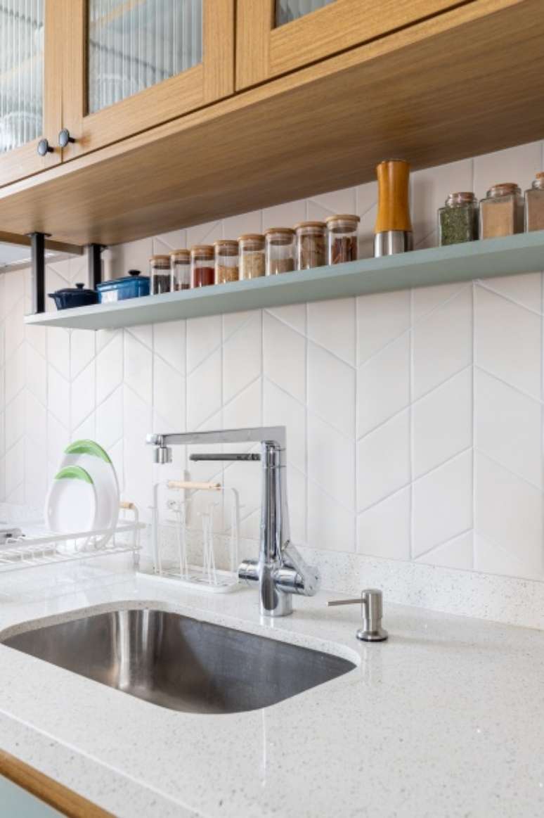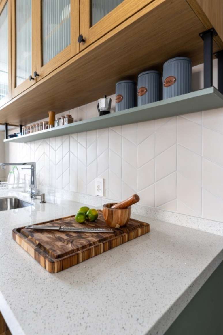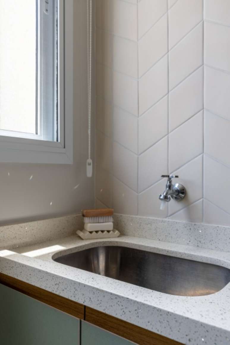 Como a moradora é designer, sua paixão pelo desenho norteou a escolha dos acabamentos: a linha JOY MZ da Portinari foi escolhida para o banheiro e para a parede da cozinha, já que a textura se assemelha à do papel de aquarela.