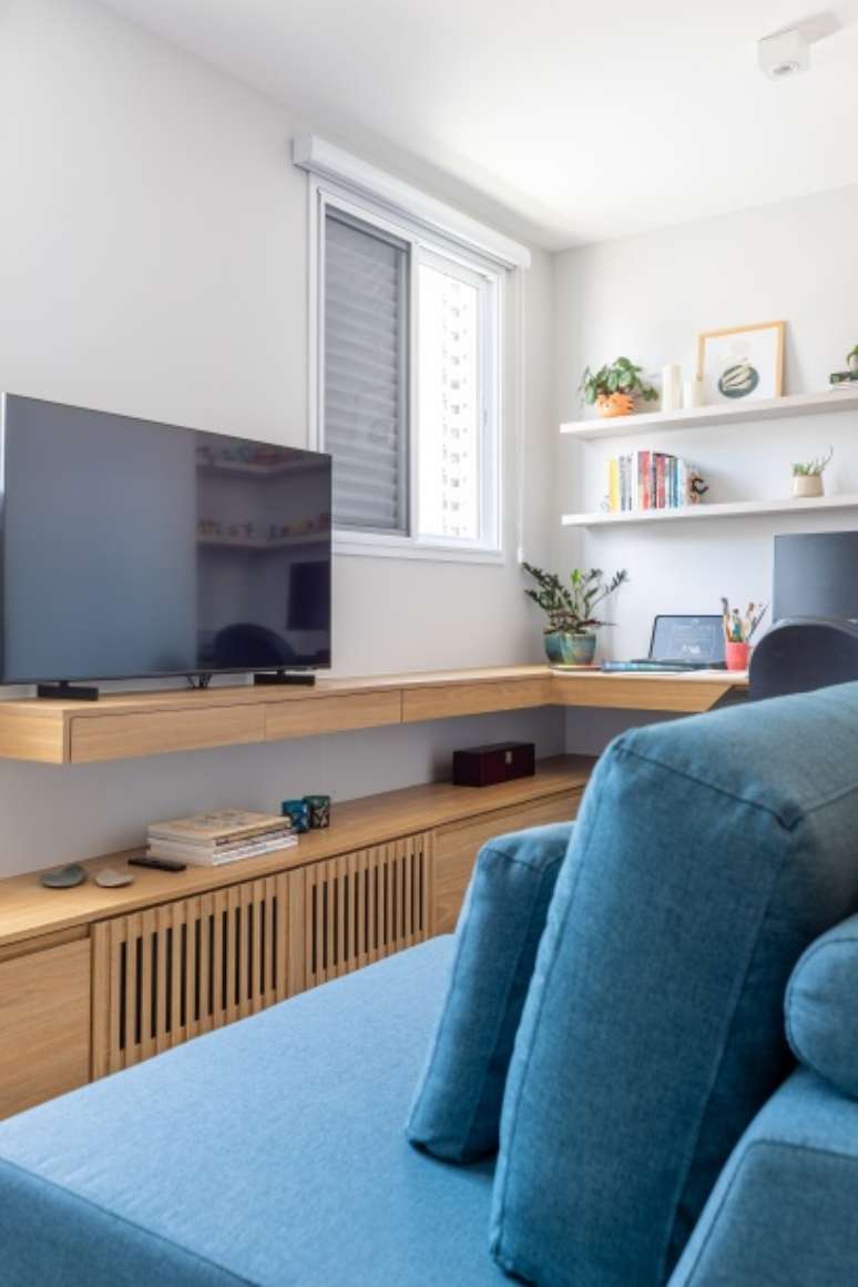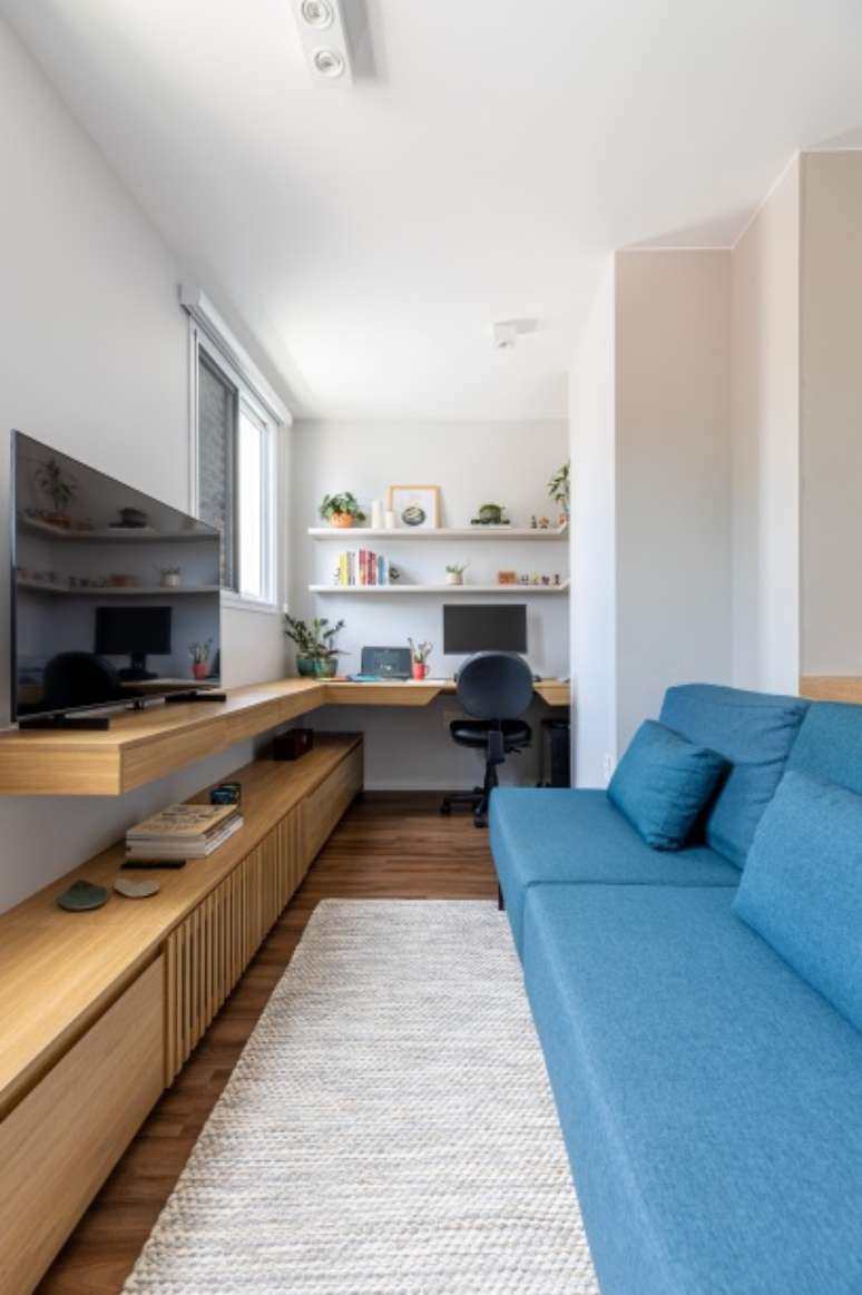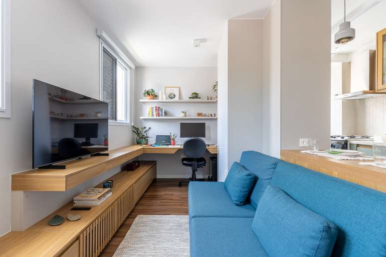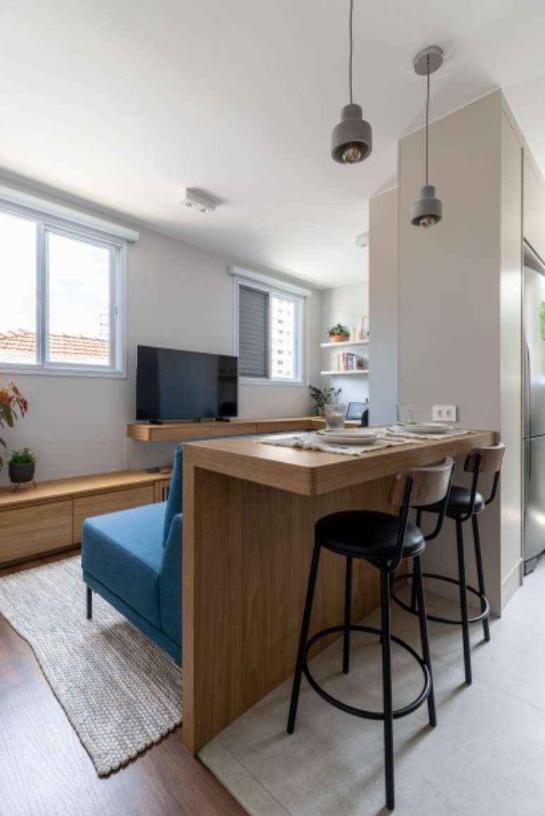 A bancada que separa a cozinha da sala permite assistir à TV durante as refeições (ou assistir a um programa de culinária enquanto cozinha junto). Ali do lado está a sala de estar e o escritório fica mais escondido, onde era um segundo quarto, para que a cliente não enxergue de cara o trabalho ao entrar em casa.