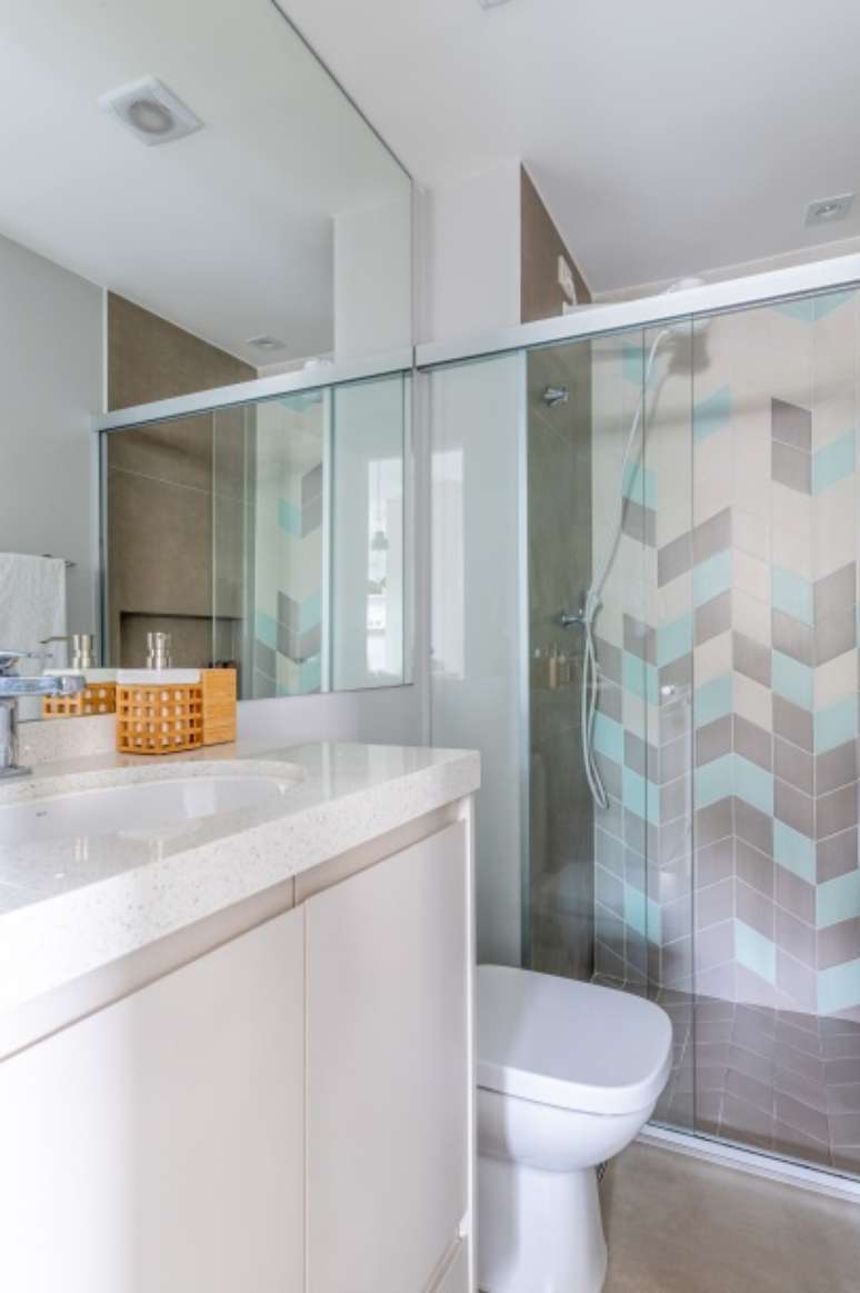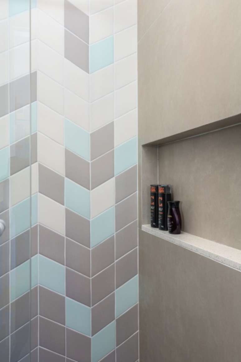 No banheiro, inclusive, foi possível instalar um nicho na parede de drywall para acomodar os produtos de banho. Aqui, tudo deu tão certo que não foi preciso nem cortar as peças da cerâmica na parede.