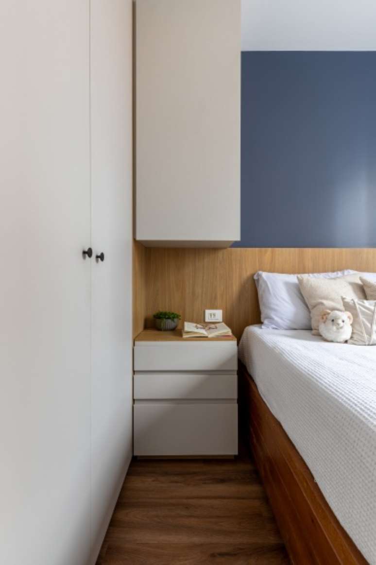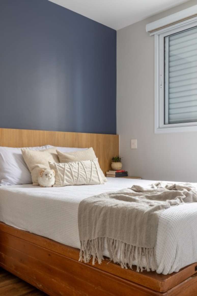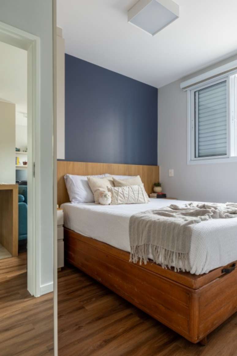 Por fim, no quarto a cor aparece apenas na parede da cabeceira, trazendo um pouco de profundidade e sem diminuir muito a sensação de amplitude. Para equilibrar, um armário mais claro e, para acolhimento, o toque da madeira na cabeceira.