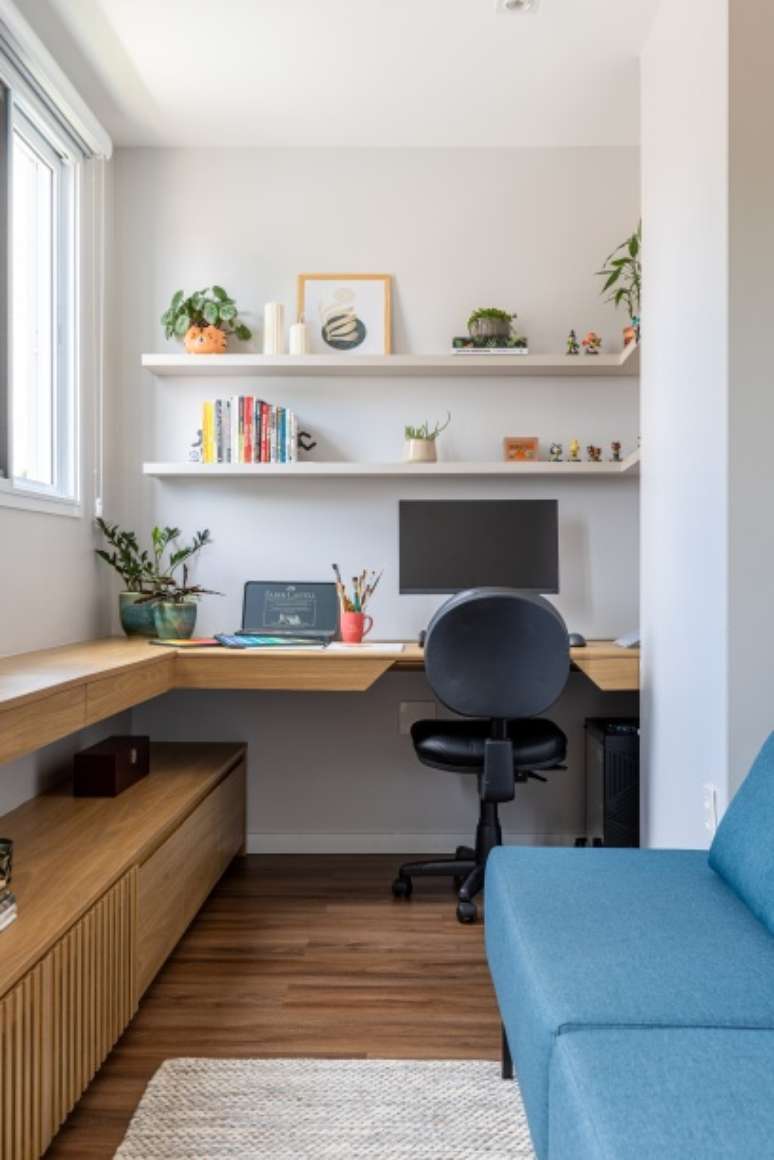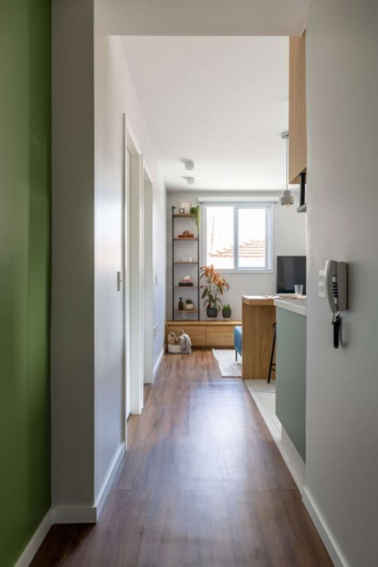Apê de 34 m² tem lavanderia, home office e muitas plantas