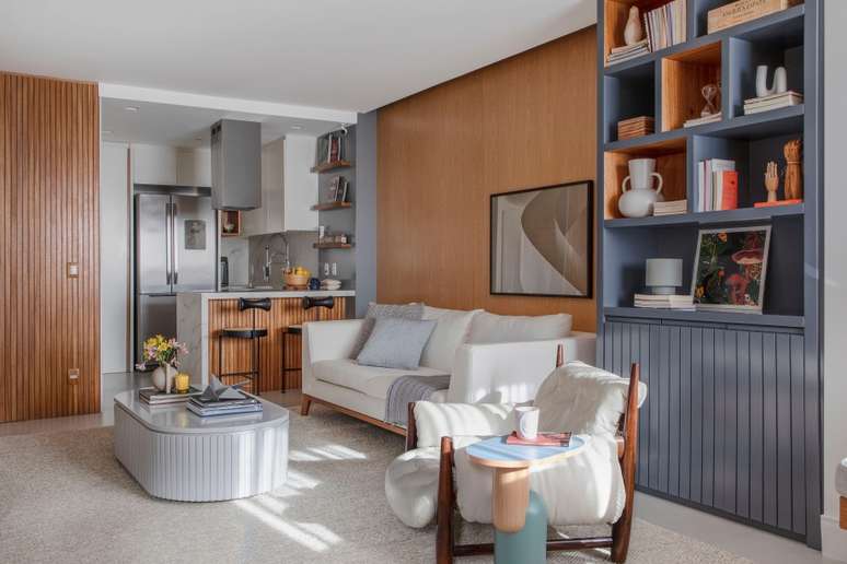 "No geral, eles queriam uma sala ampla com a cozinha integrada", conta Gabriela. "Mas, assim que o projeto foi finalizado, o morador foi transferido para um time de Portugal e o casal precisou se mudar para lá. Com isso, o apartamento virou um pouso de férias no Rio de Janeiro", acrescenta.