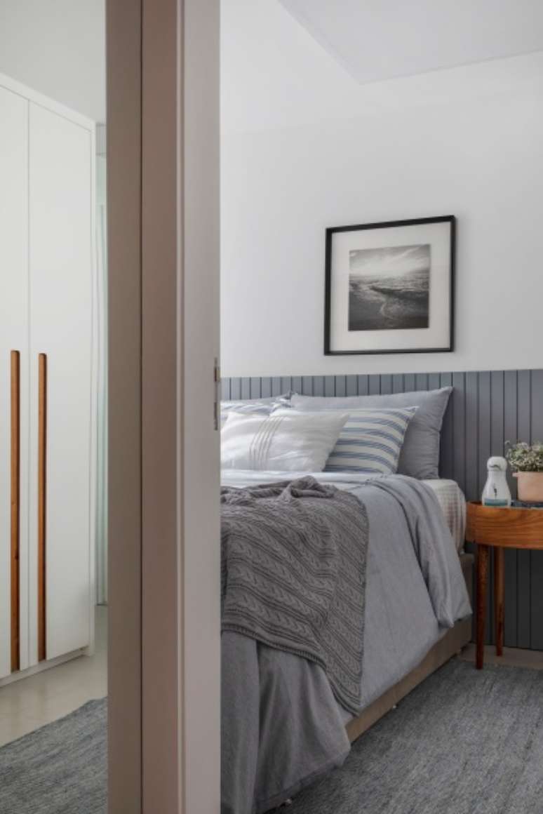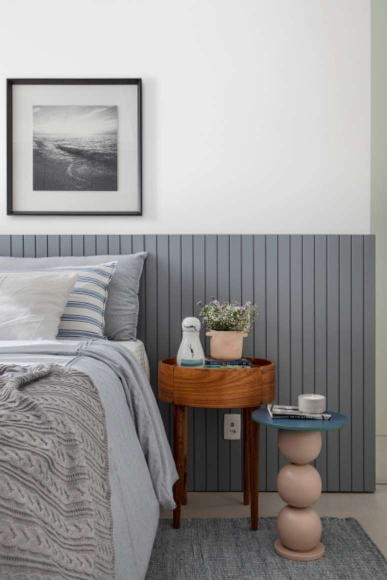 Para criar uma unidade visual em todo o apartamento, também no quarto do casal o cinza foi usado como a base do décor, porém aqui num tom mais claro para deixar o ambiente mais leve e suave.