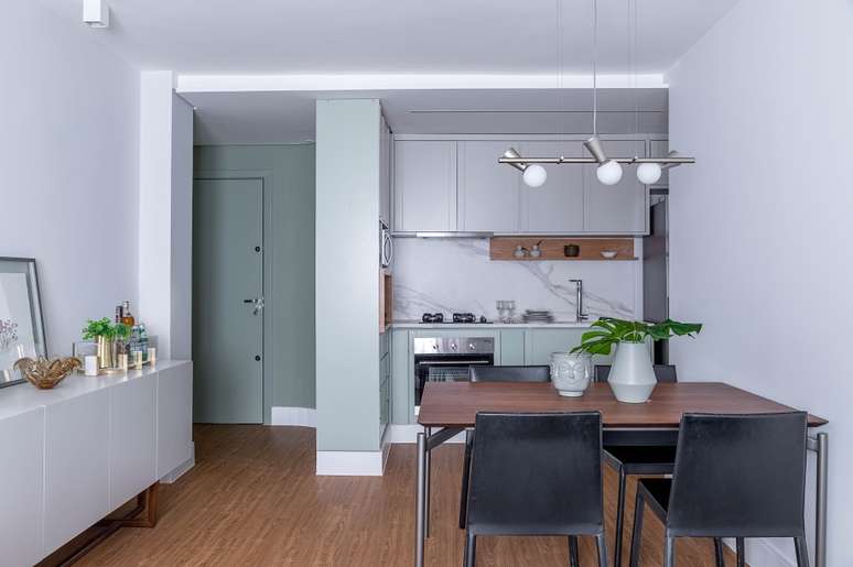 Apê de 58 m² tem área social integrada e marcenaria colorida na cozinha