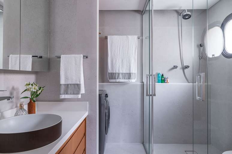 É uma solução simples, mas que faz toda a diferença na rotina da casa", destaca Carina. O box até o teto oferece elegância para o cômodo e, para propiciar a sensação de amplitude, a especialista aplicou o mesmo revestimento no piso e paredes.