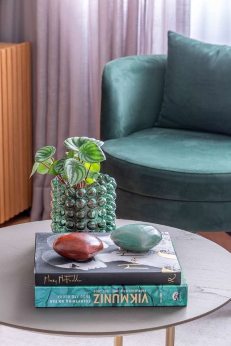 "Outra referência que empregamos foram diferentes nuances de verde. Por ser a cor preferida da moradora, o espalhamos em vários pontos da decoração sem perder a elegância e torná-lo enjoativo", relembra Carina. A cor está nas almofadas, poltrona, vasos, pufe e até mesmo na marcenaria da cozinha.