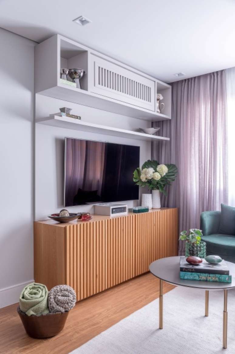 Na prateleira superior a TV, a porta de madeira ripada branca foi o recurso para camuflar o ar-condicionado. "Essas pequenas soluções pontuais aliam a alta funcionalidade dos móveis, sem abrir mão da beleza e suavidade do ambiente", pontua a arquiteta.