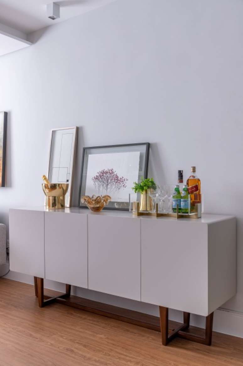 Deixando a composição ainda mais interessante, a arquiteta pontuou alguns detalhes em MDF madeirado. O nicho abriga o cantinho do café.