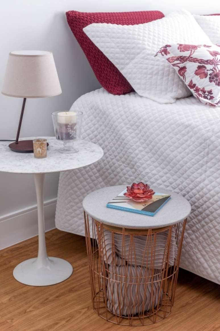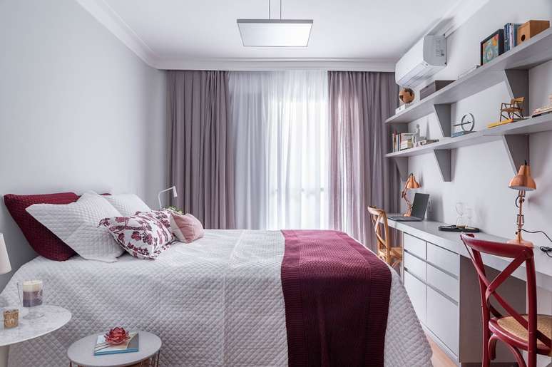 Para o dormitório, a proposta da arquiteta foi trabalhar um ambiente acolhedor pautado nas cores claras e o magenta como destaque para a peseira e as almofadas.