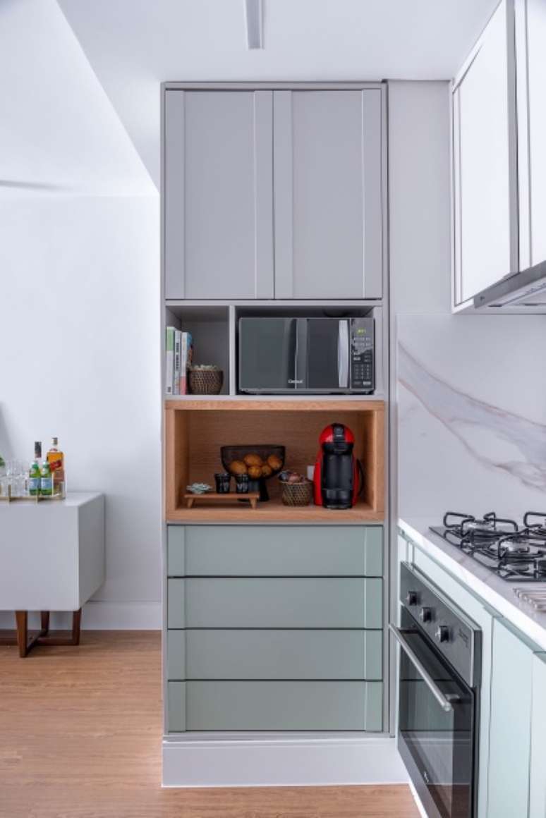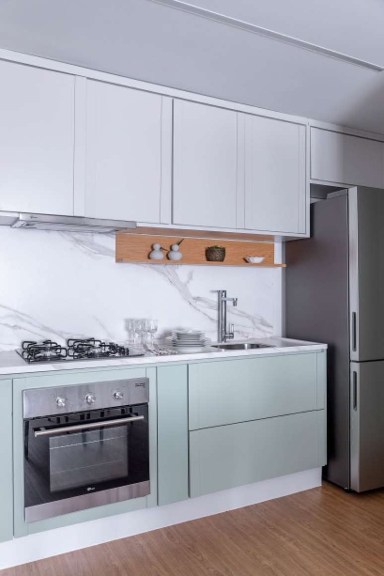 Compacta e funcional, a cozinha é considerada o coração deste projeto. Os armários, feitos em laca e sob medida, agregam modernidade e evocam uma combinação diferente: enquanto a parte inferior é verde menta, os armários superiores são mais clássicos, revelando a sobriedade do cinza fendi.