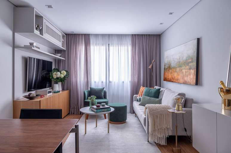O estar, que também funciona como sala de TV, foi contemplado por um rack de madeira com portas ripadas que não comporta apenas os itens pertinentes à função principal, mas também atua como buffet para armazenar as louças especiais da moradora.