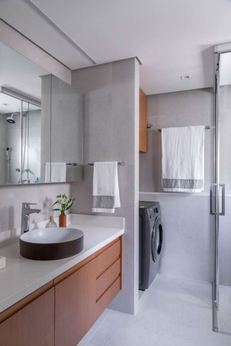 Por ser um apartamento do tipo flat e sem lavanderia, o prédio conta com uma lavanderia de uso comum. "Porém, com o intuito de tornar a vida da moradora mais prática, trouxemos para o banheiro uma máquina lava e seca.