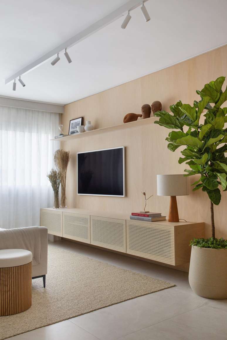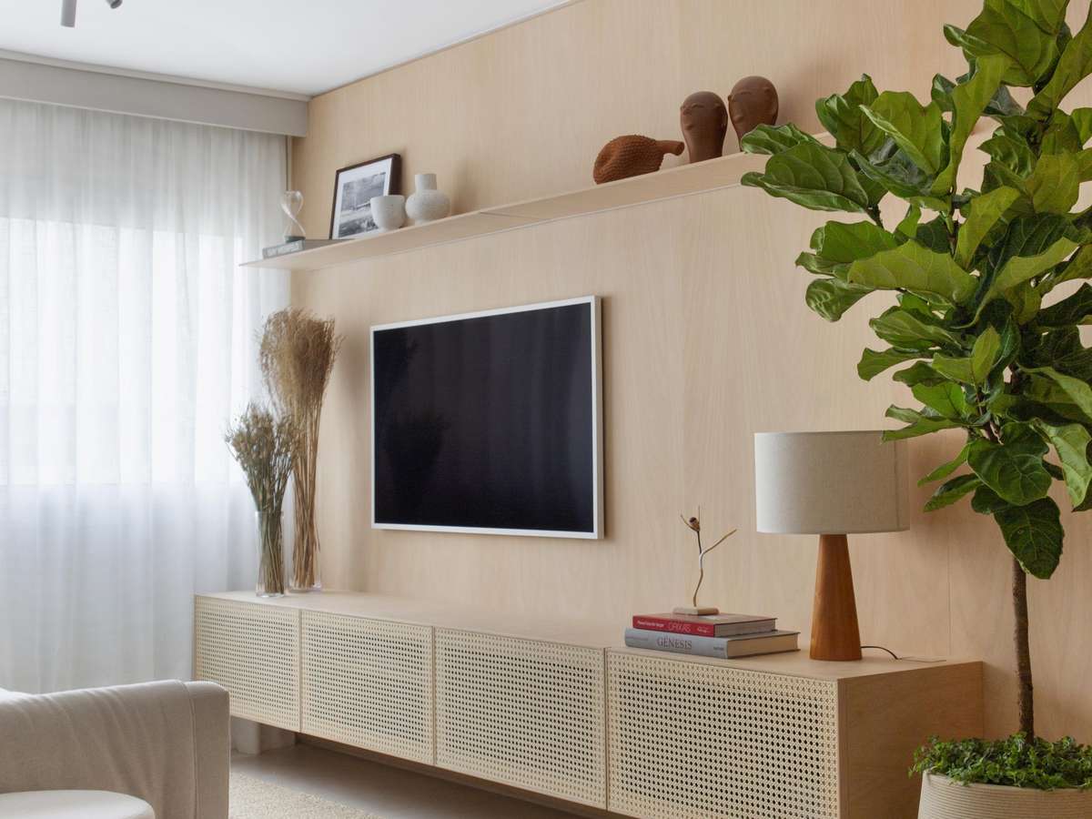Na sala, o ponto alto é o painel de madeira Tauari, que faz tanto a parede da TV quanto da cozinha. Ele entra também para fazer um contraste e aquecer o espaço, já que o piso é de porcelanato em função dos cachorros.