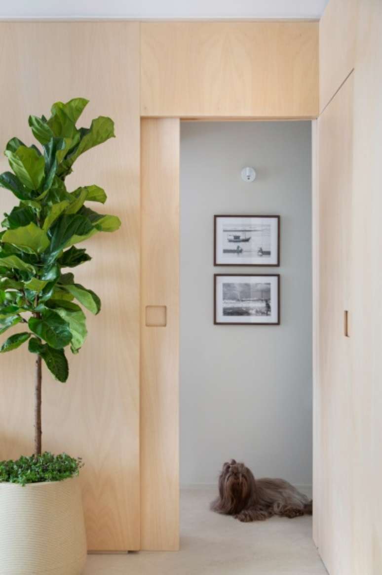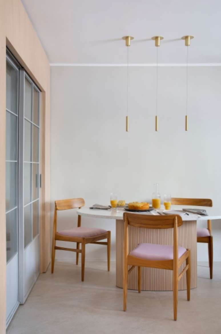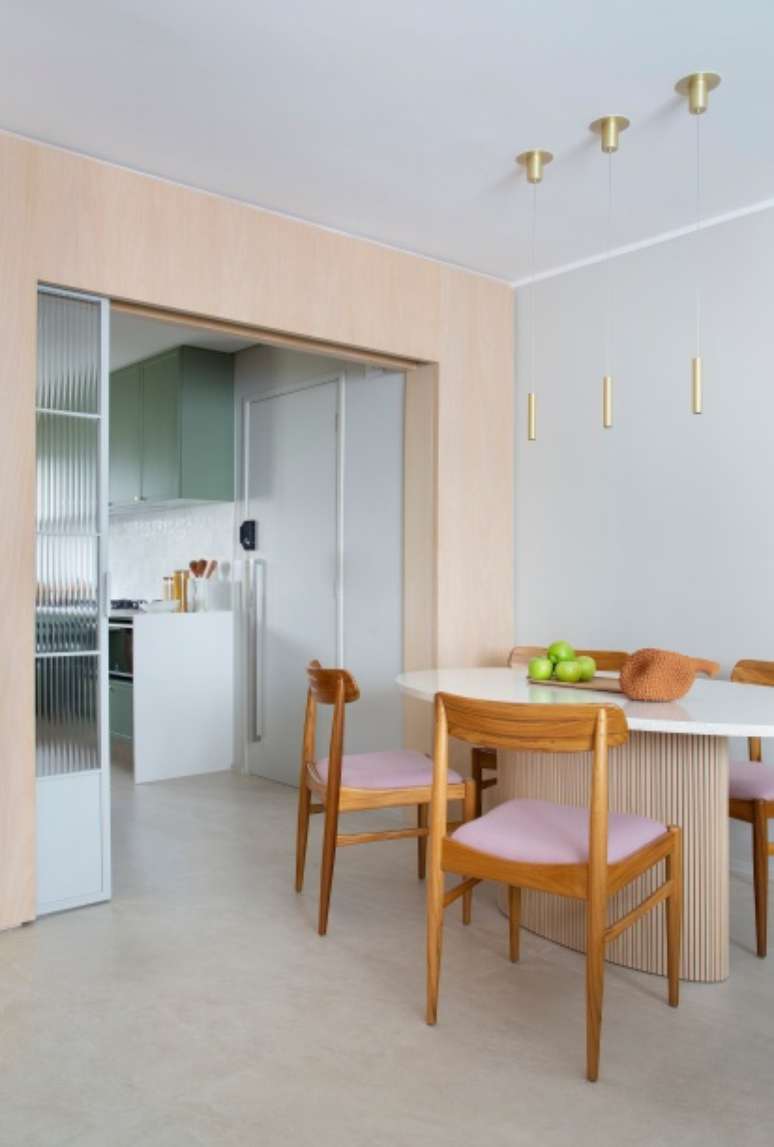 "Então, para solucionar tanto o cheiro ao cozinhar quanto a iluminação natural, propusemos portas de serralheria com vidro canelado embutidas em um painel de marcenaria", explicam.