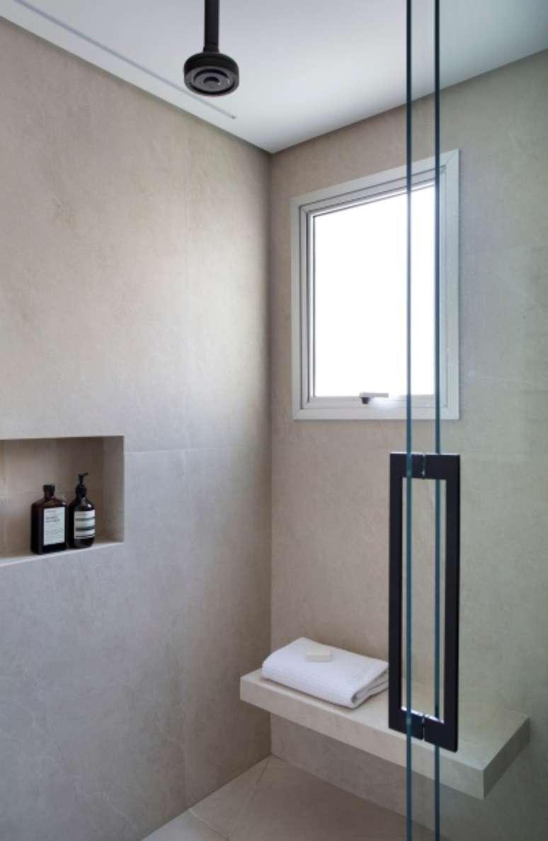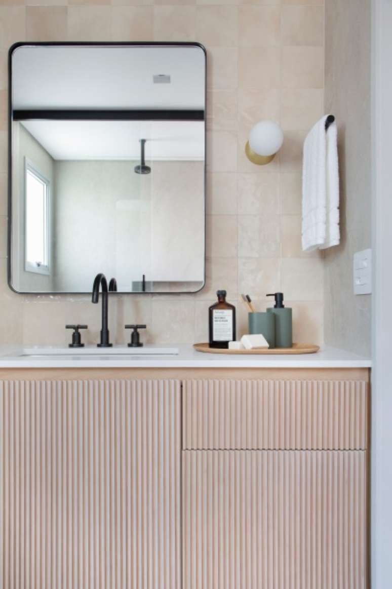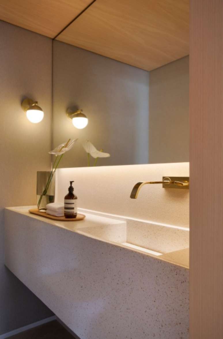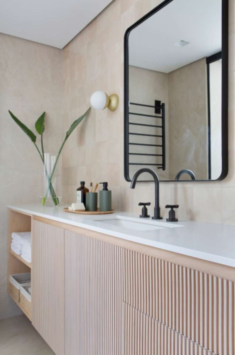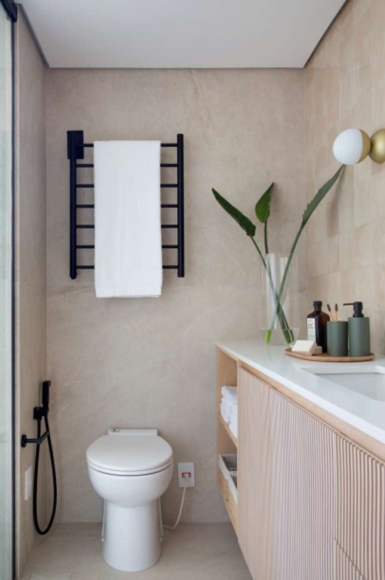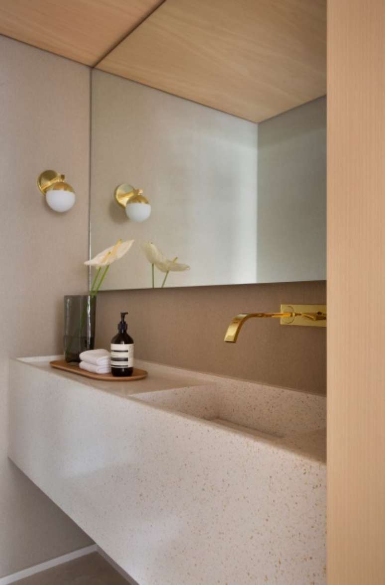 "Outro desafio era criar um lavabo em um local que não era área úmida, nesse apartamento todo o esgoto acontece no vizinho. Para resolver esse problema, usamos o vaso com saída horizontal e levamos pela parede até o antigo banheiro da funcionária. Essa mudança foi demais!", contam.