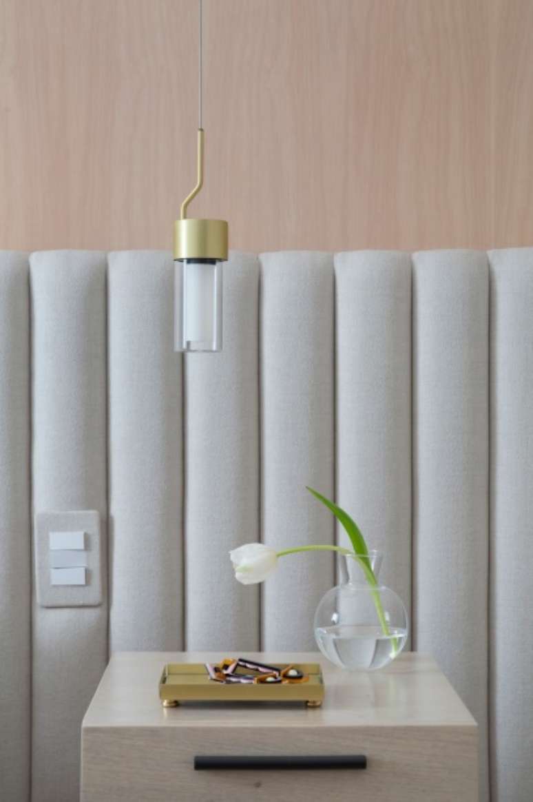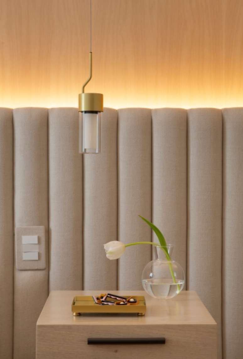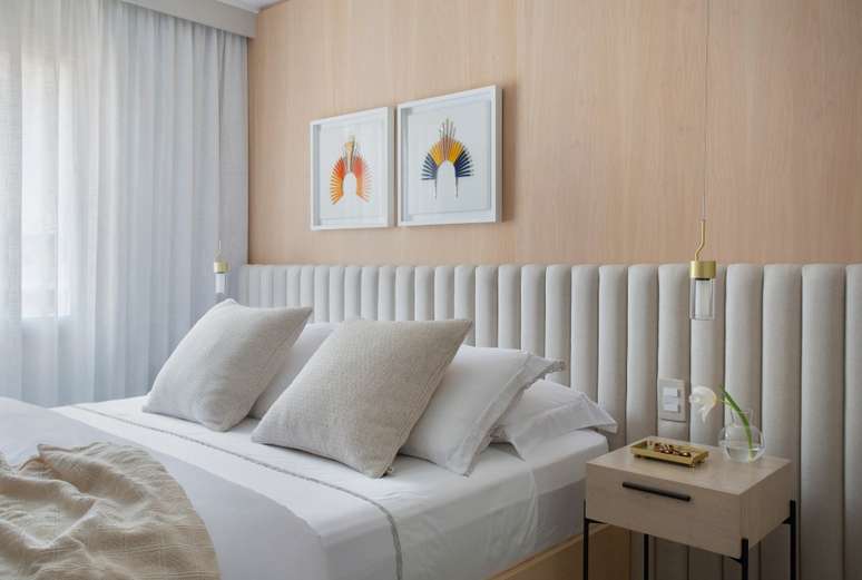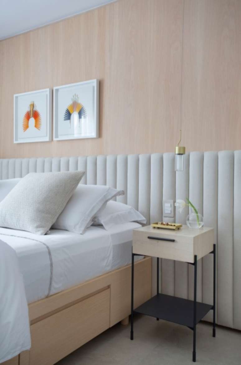 "Com a pandemia, os moradores passaram a trabalhar em casa, e ter um espaço para trabalhar tranquilo foi uma das necessidades do casal. Então pensamos o segundo quarto de uma forma híbrida, deveria ter um espaço para trabalhar e outro para receber um hóspede.