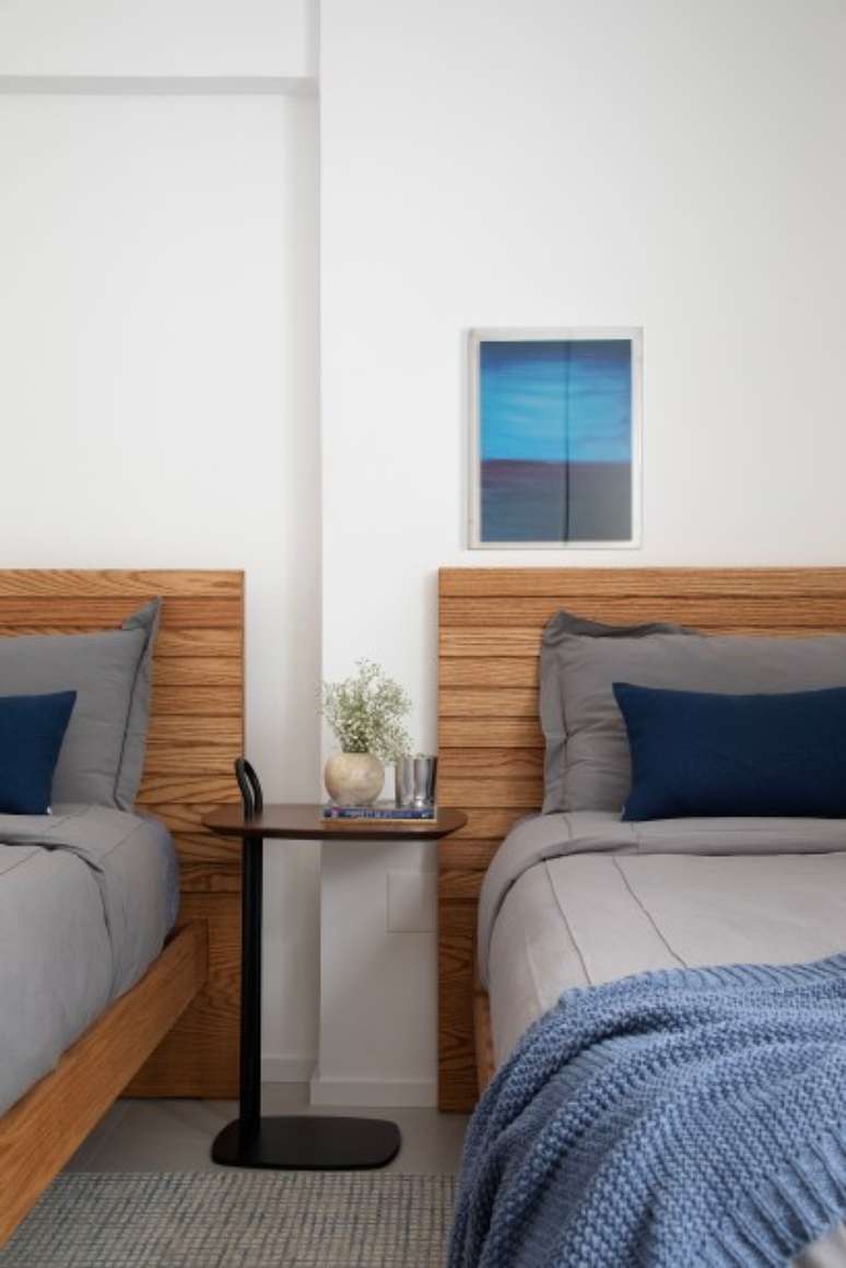 Na decoração, todos os móveis são novos e, para agilizar a entrega, foram comprados na Líder Interiores antes da finalização do projeto executivo. Algumas peças foram feitas sob medida para os espaços e outras escolhidas a dedo, como o sofá modular Way, que também pode ser usado como camas extras, em dias de casa cheia, já que seus encostos triangulares são removíveis. Entre as obras de arte, vale destacar o par de quadros em tons pastel, do artista Thomaz Velho, expostos sobre o aparador da sala.