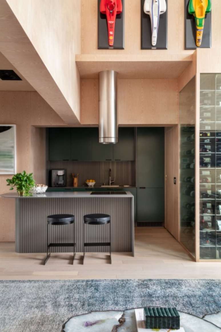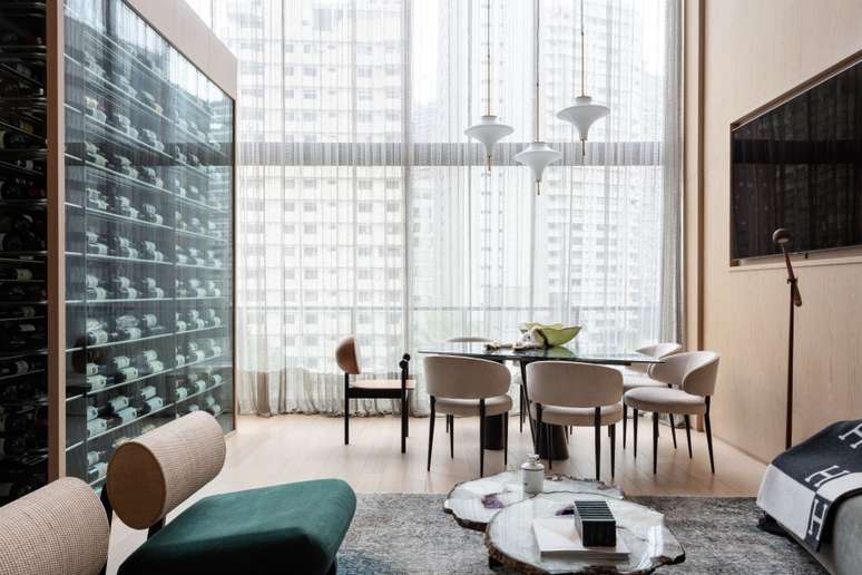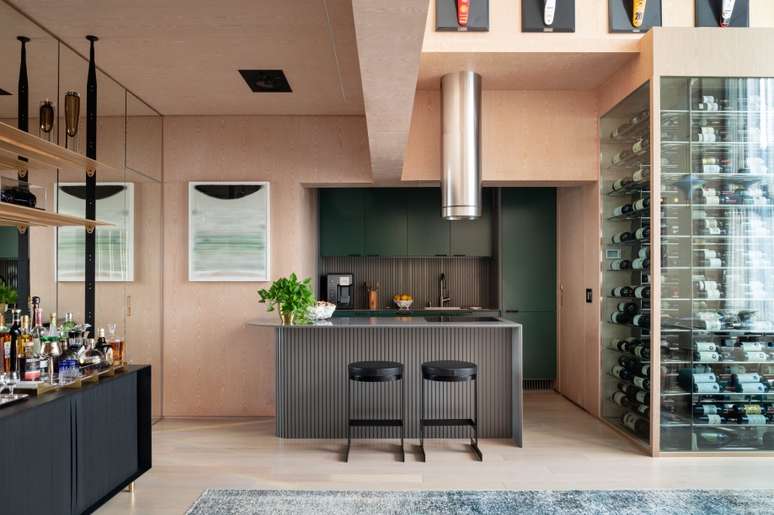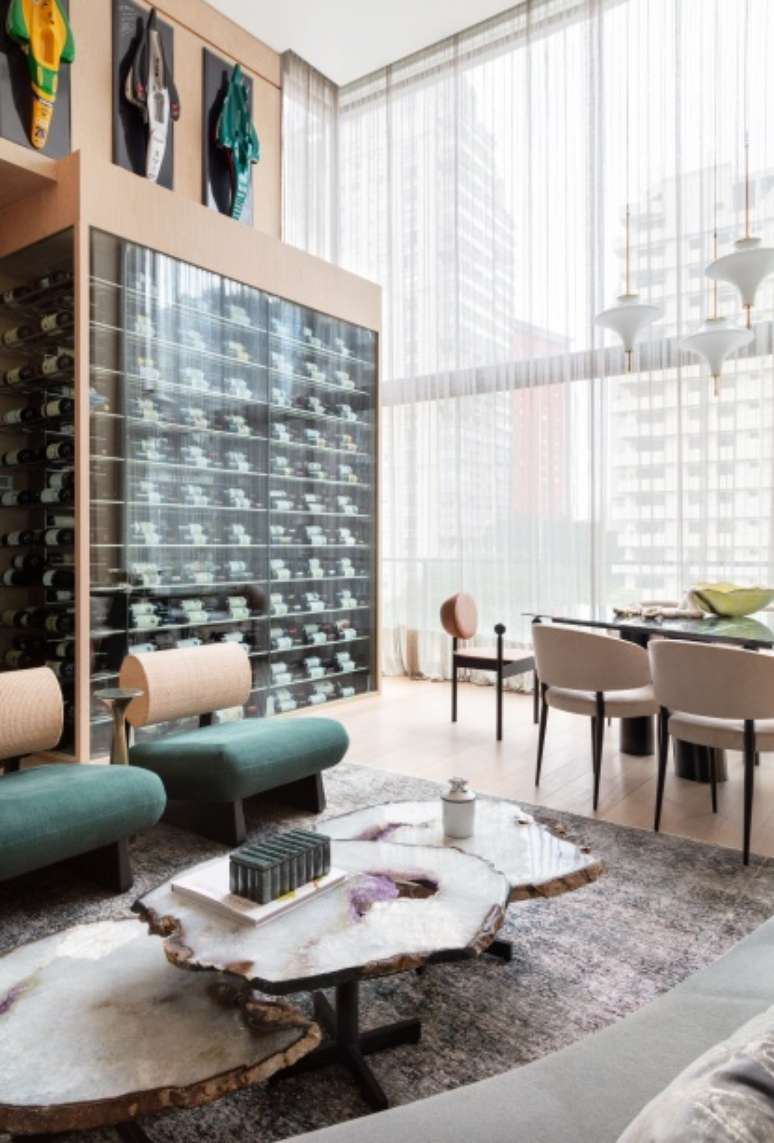 Apê de 90 m² tem sala com pé-direito duplo e adega para 600 garrafas