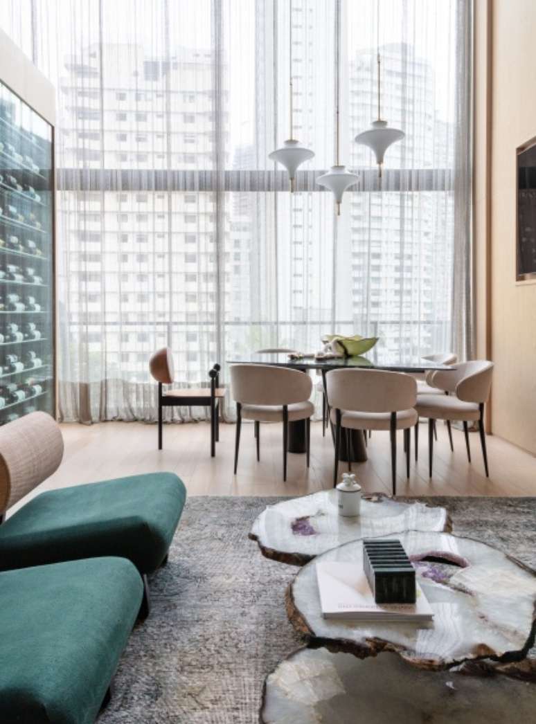 Na sala de jantar rouba a cena a mesa assinada por Guilherme Torres, e, sobre ela, o trio de pendentes Docc, também do Jader Almeida.