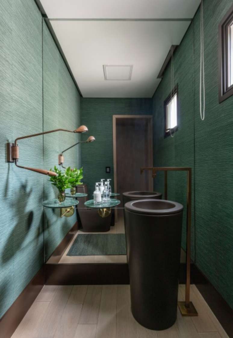 No geral, a paleta de cores do décor mescla tons de cinza, verde folha e preto com madeira carvalho, material presente não só nas forrações de paredes e tetos como também no piso, resultando em uma atmosfera ao mesmo tempo masculina, sofisticada e acolhedora.