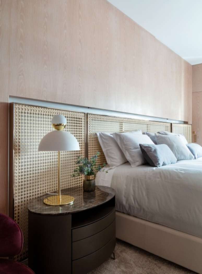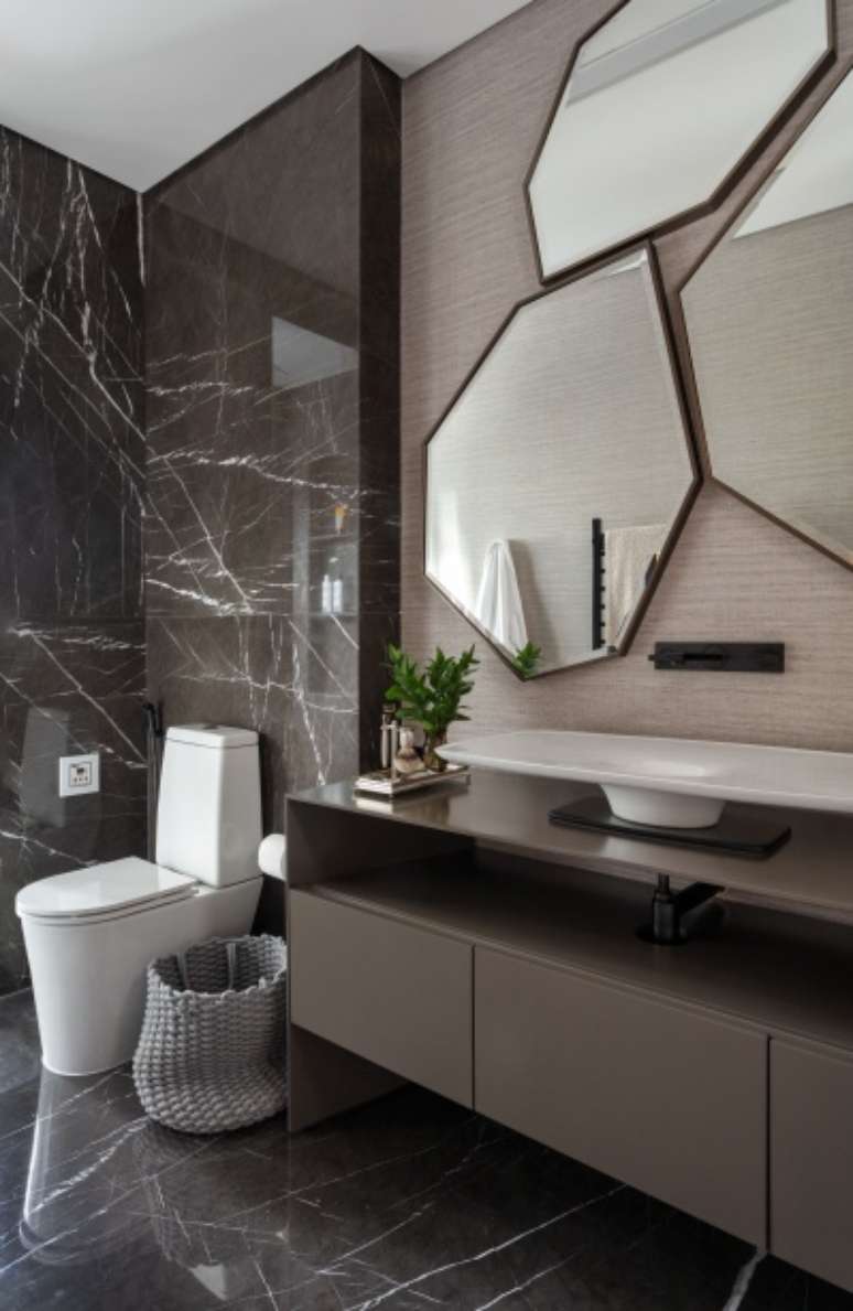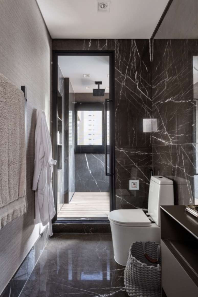 Além da madeira, o mármore também está bastante presente neste projeto: ele foi usado como revestimento de todo banheiro, no pórtico do elevador e no tampo de várias mesas (de jantar, de apoio e de cabeceira), deixando os ambientes com uma atmosfera mais sofisticada.