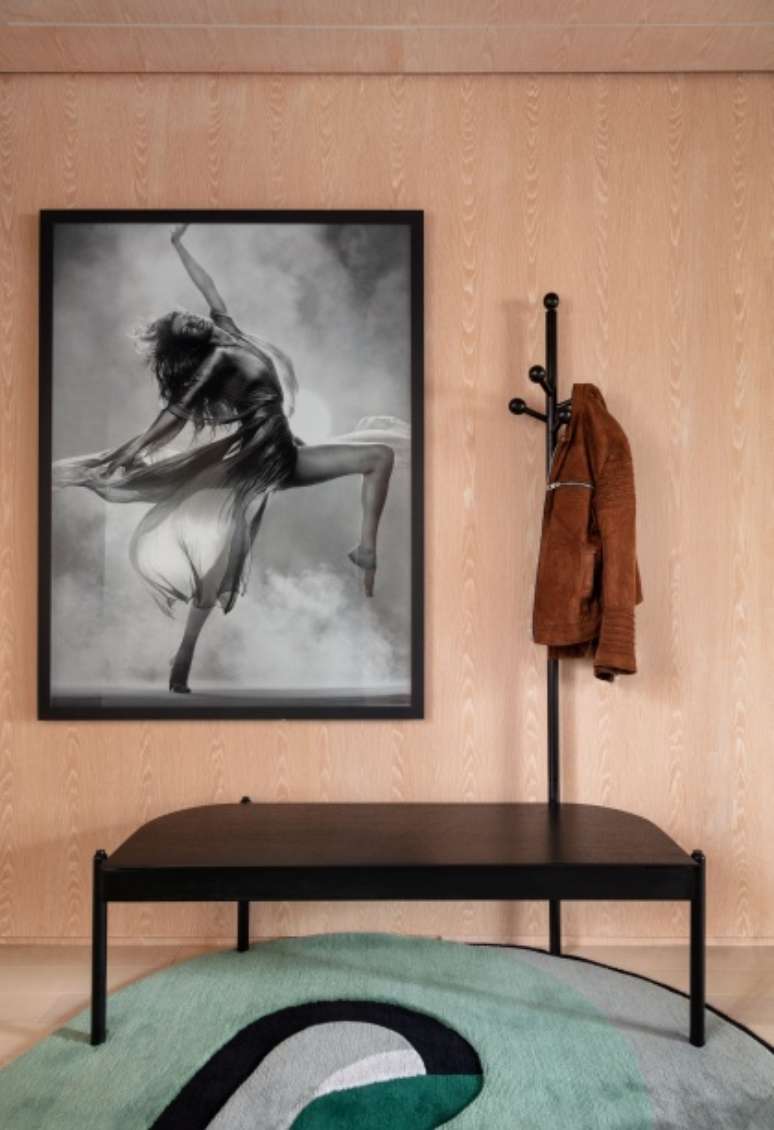 Já o hall de entrada foi ambientado com tapete de lã natural desenhado por Juliana Vasconcellos, banco do Guilherme Torres e o quadro da top model Giselle Bündchen, retratada pelo celebrado fotógrafo Gui Paganini.