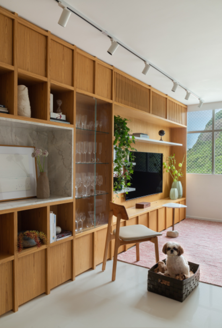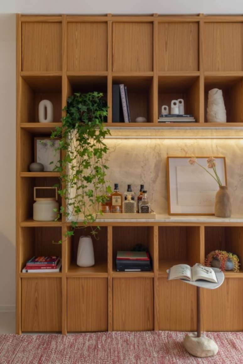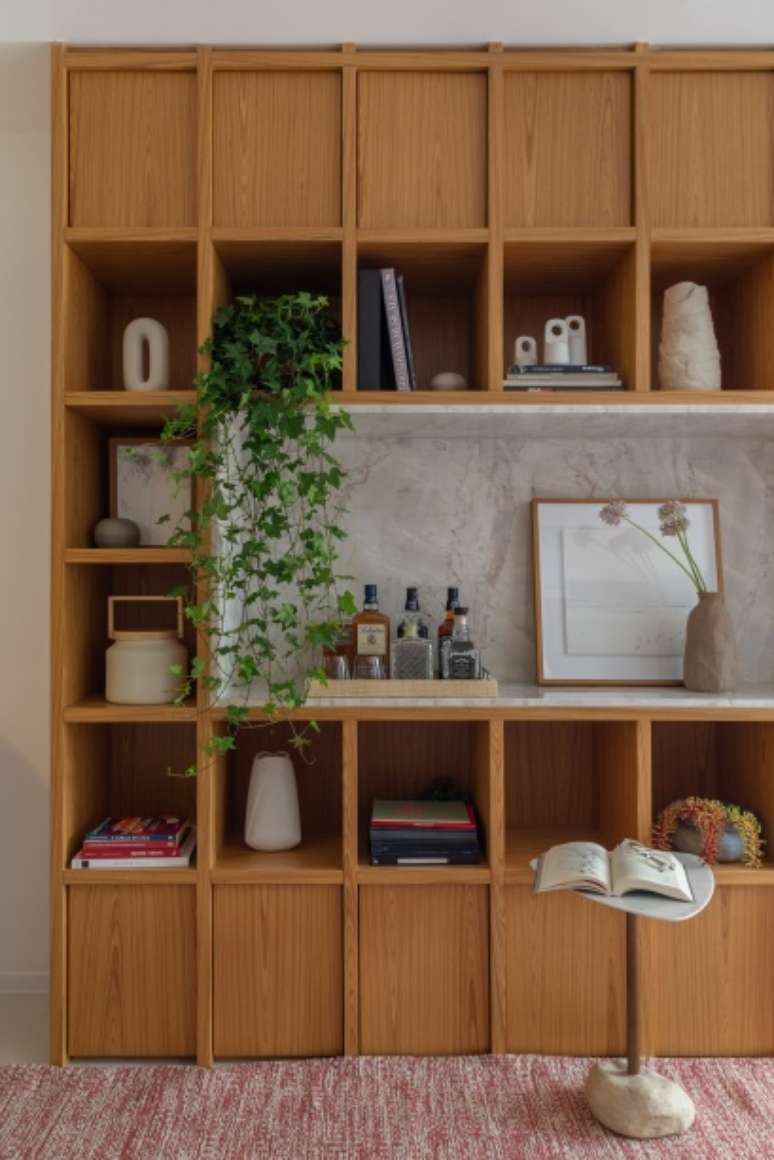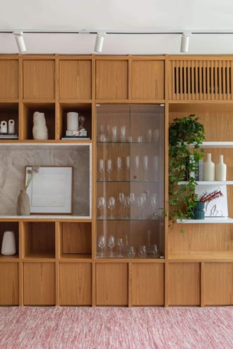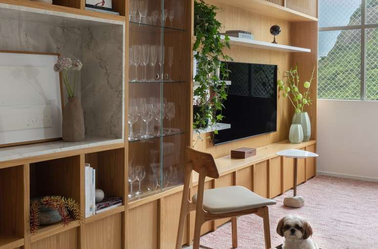 Outro destaque na sala é a estante modular em marcenaria que ocupa toda a extensão da parede principal e foi projetada pelo próprio arquiteto para assumir múltiplas funções: aparador, cristaleira, home de TV e armários.