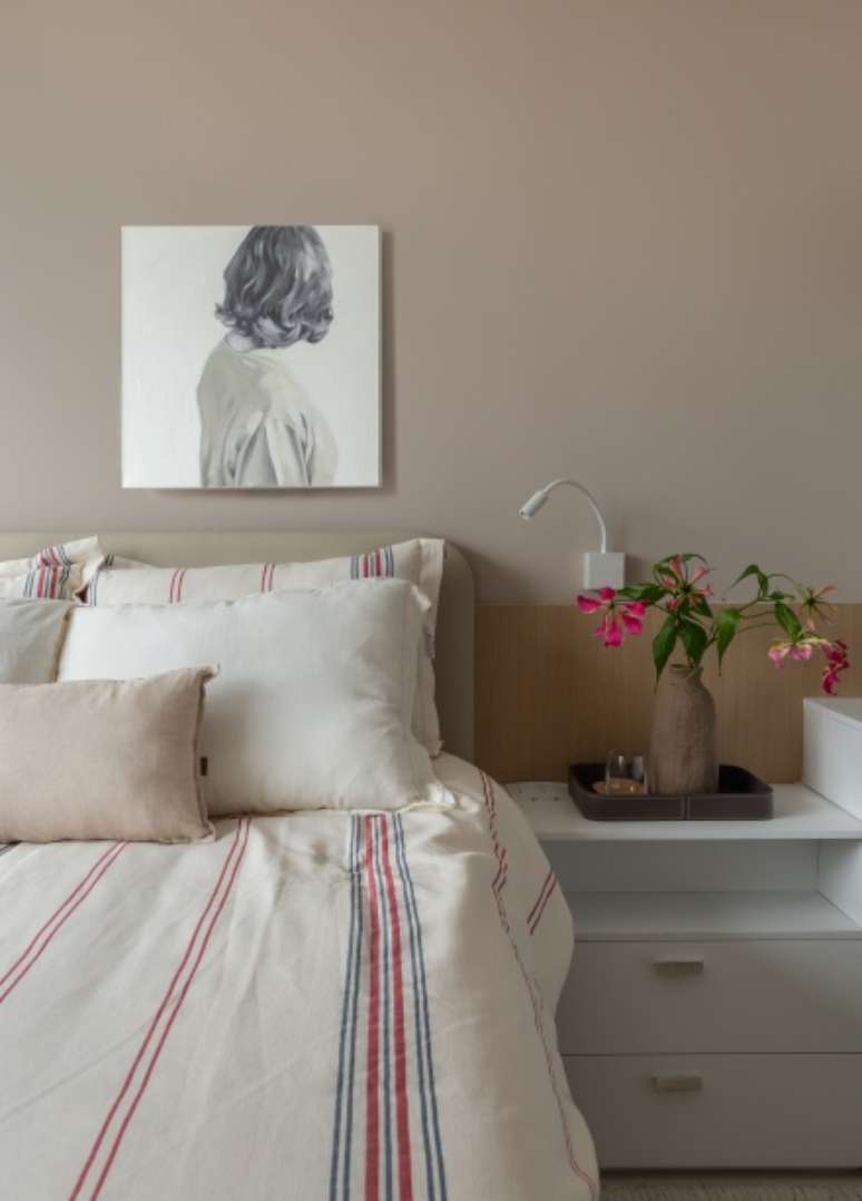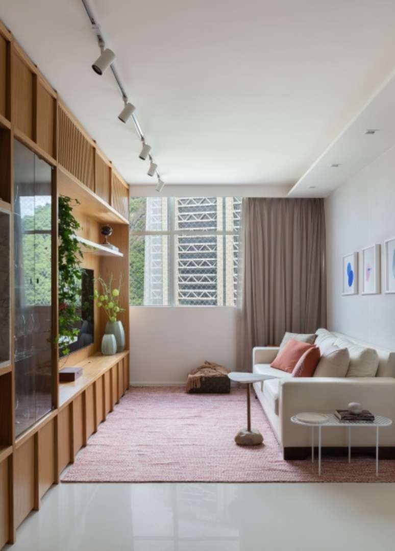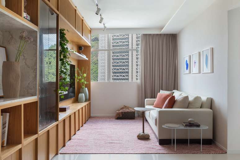 No geral, a decoração segue o estilo contemporâneo e tem uma base neutra, clara e atemporal, com marcenarias em freijó natural na sala e em tons mais claros nos quartos. As cores aparecem pontualmente em algumas obras de arte, no tapete e nas almofadas. Com exceção do sofá, que já estava no apartamento e foi aproveitado, toda a decoração é nova.