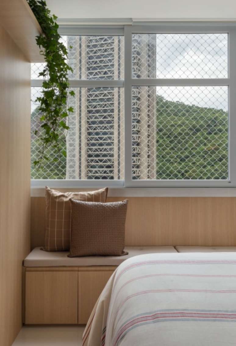 Segundo o arquiteto, o projeto buscou conjugar aconchego e amplitude, e, através da nova decoração e paleta de cores, se conectar ao máximo com a paisagem exuberante vista da janela da sala e dos quartos.