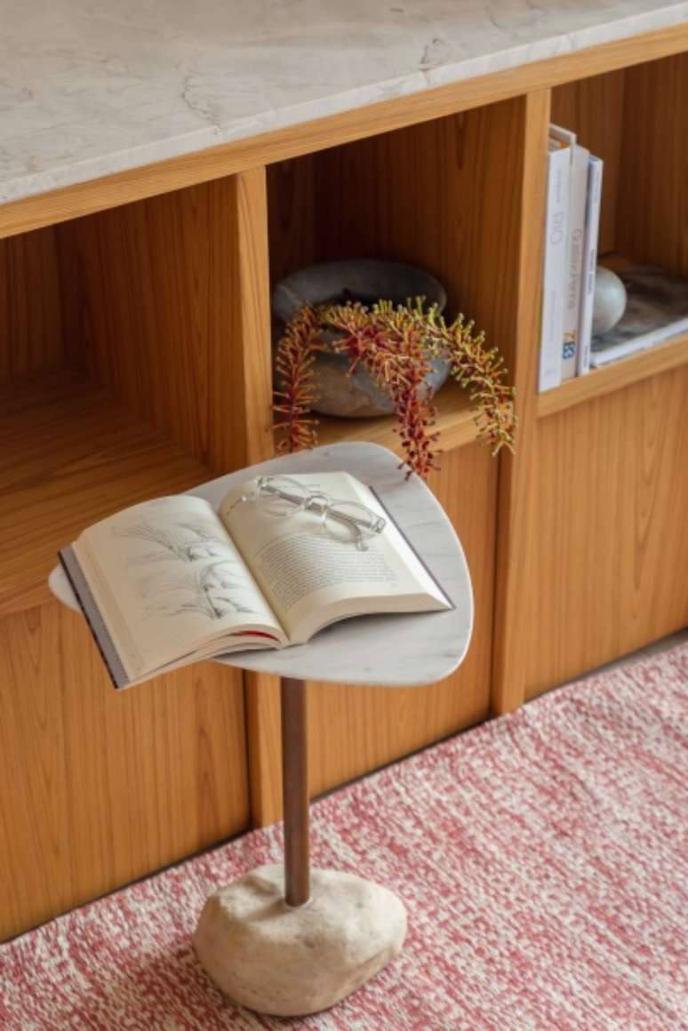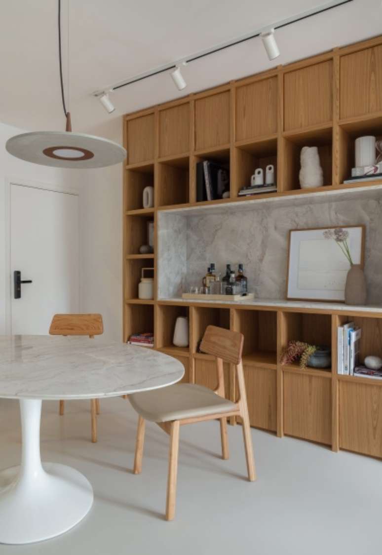 Entre as peças que foram adquiridas, na sala, o arquiteto destaca a mesa de jantar Saarinen com tampo de mármore (mesmo material usado no nicho da estante com função de aparador) e as cadeiras Dera (da Lider Interiores).